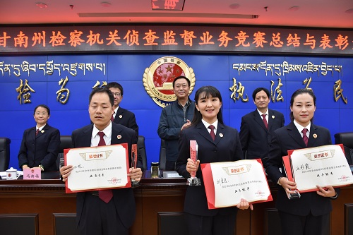 据悉,此次业务竞赛突破以往只制作《审查逮捕意见书》的既定模式,大胆创新,采用考察平常大家比较忽视的《纠正违法通知书》、《不捕理由说明书》、《不捕案件补充侦查提纲》来作为考察点。参赛选手沉着应战,通过法学基础理论、证据审查、综合判断、法律监督、舆情处置、逻辑思维、应变表达、心理素质和PPT展示的多项角逐。评选出了“2018年度全州检察机关侦查监督业务能手”、“2018年度全州检察机关侦查监督业务优秀选手”;并授予碌曲县院“2018年度全州检察机关侦查监督业务竞赛优秀组织奖”。