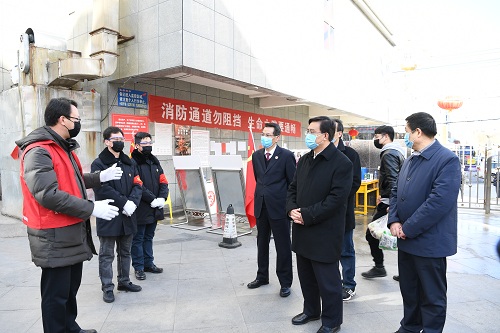 随后,朱玉来到凤凰园小区查看疫情防控工作,并看望慰问在一线配合开展联防联控的检察干警。凤凰苑小区是定西市安定区中华路街道江夏社区最大的小区,日常出入人流量极大。疫情发生后,定西市组建市直党员突击队开展联防联控工作,定西市检察院16名党员和入党积极分子自愿报名参加突击队,其中9名被安排在该小区出入口值守。朱玉对大家踊跃报名、主动参与疫情防控志愿者活动给予充分肯定和高度评价,他指出,检察干警积极响应党组织号召、迅速投入一线,体现了服务大局的担当作为,展现了新时代检察干警的良好形象。朱玉鼓励大家在做好个人防护、合理安排工作和休息时间的同时,继续配合当地开展好疫情防控相关工作,为打赢疫情防控阻击战贡献力量。