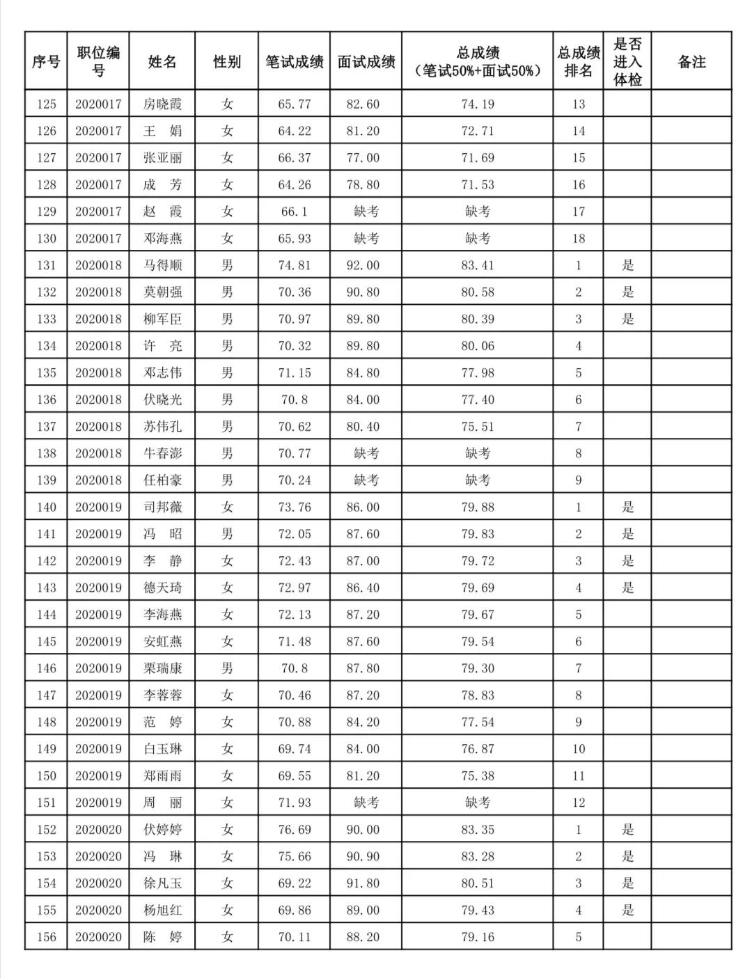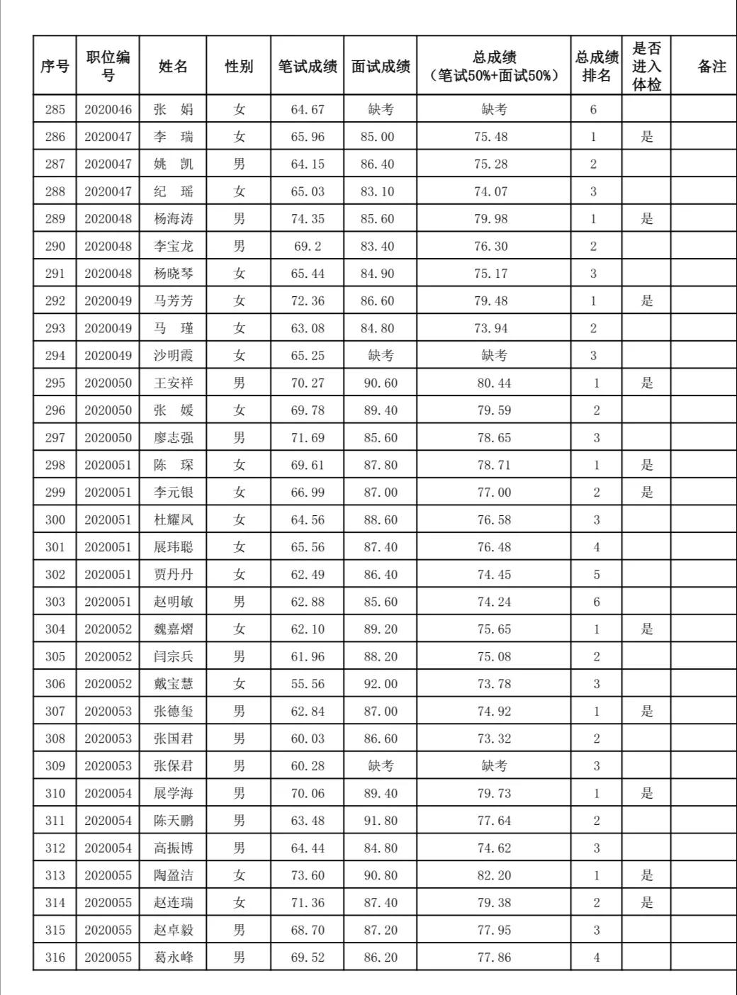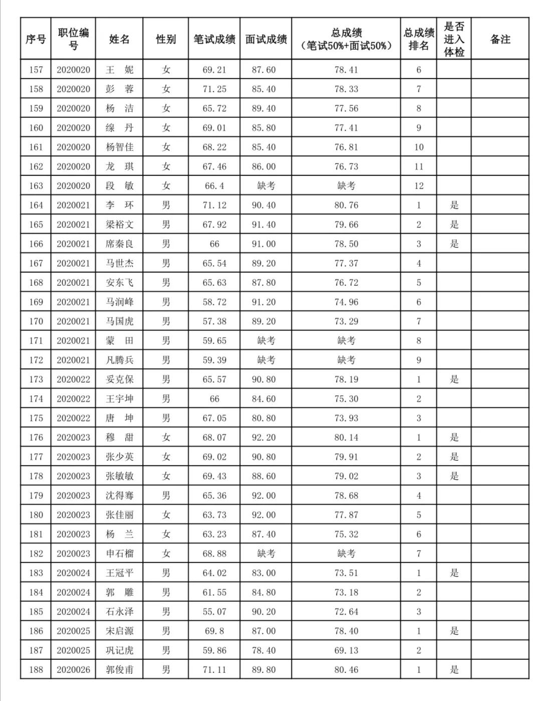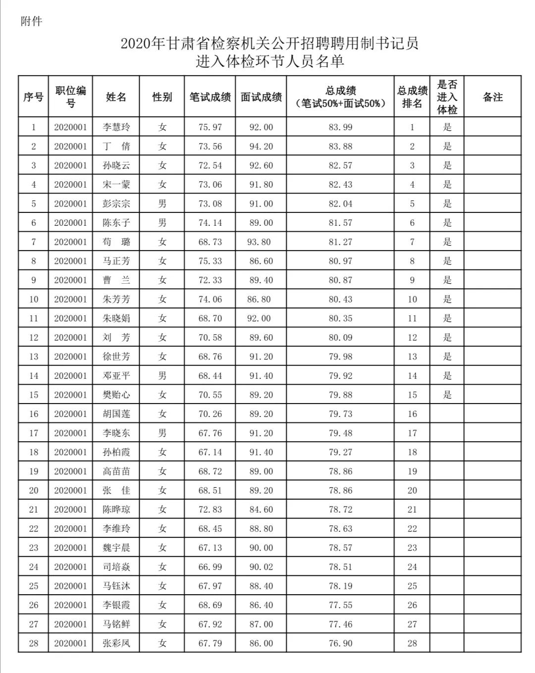 2020年甘肃省检察机关公开招聘聘用制书记员已完成笔试、资格复审、面试等环节,按照《招聘公告》规定,应试人员的总成绩计算公式为:总成绩=笔试成绩×50%+面试成绩×50%( 最终成绩保留小数点后两位),根据总成绩由高到低的次序,等额确定进入体检环节人选。