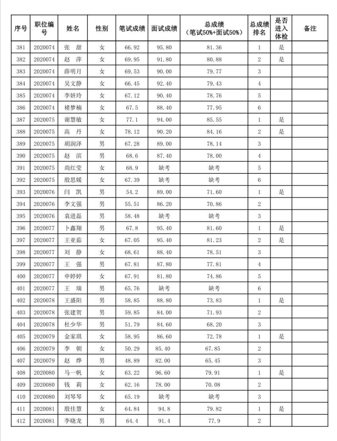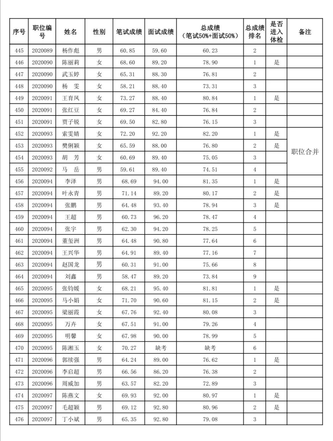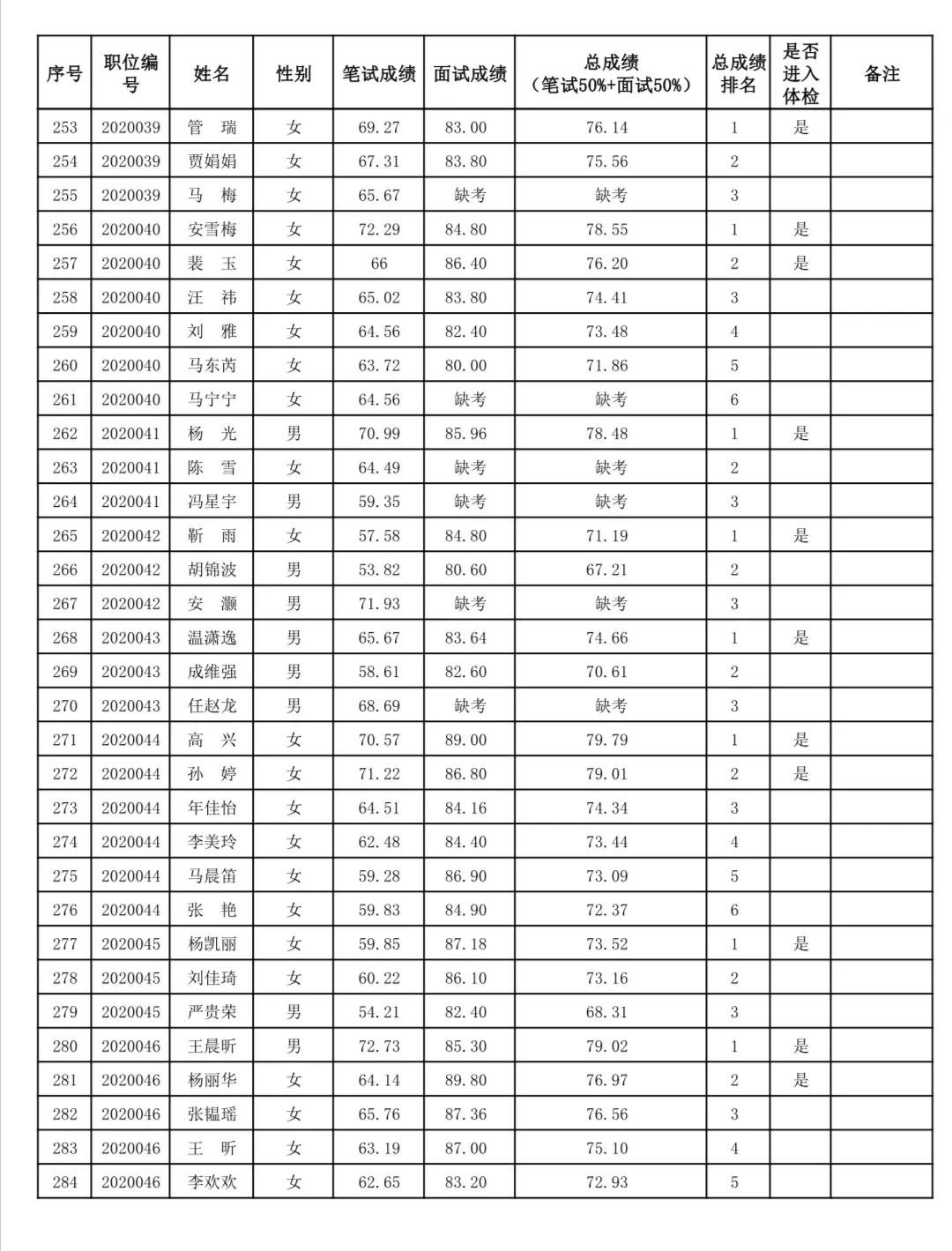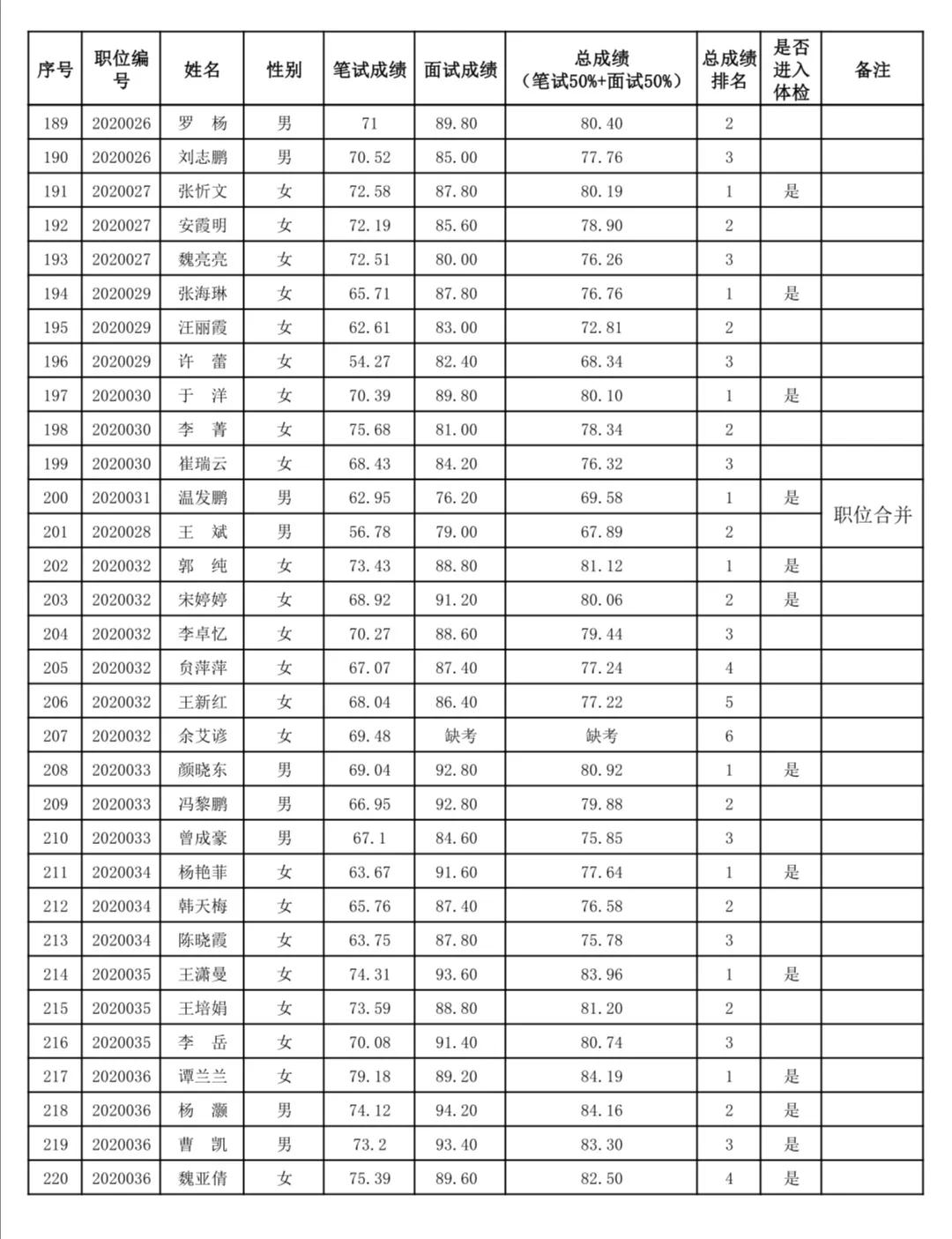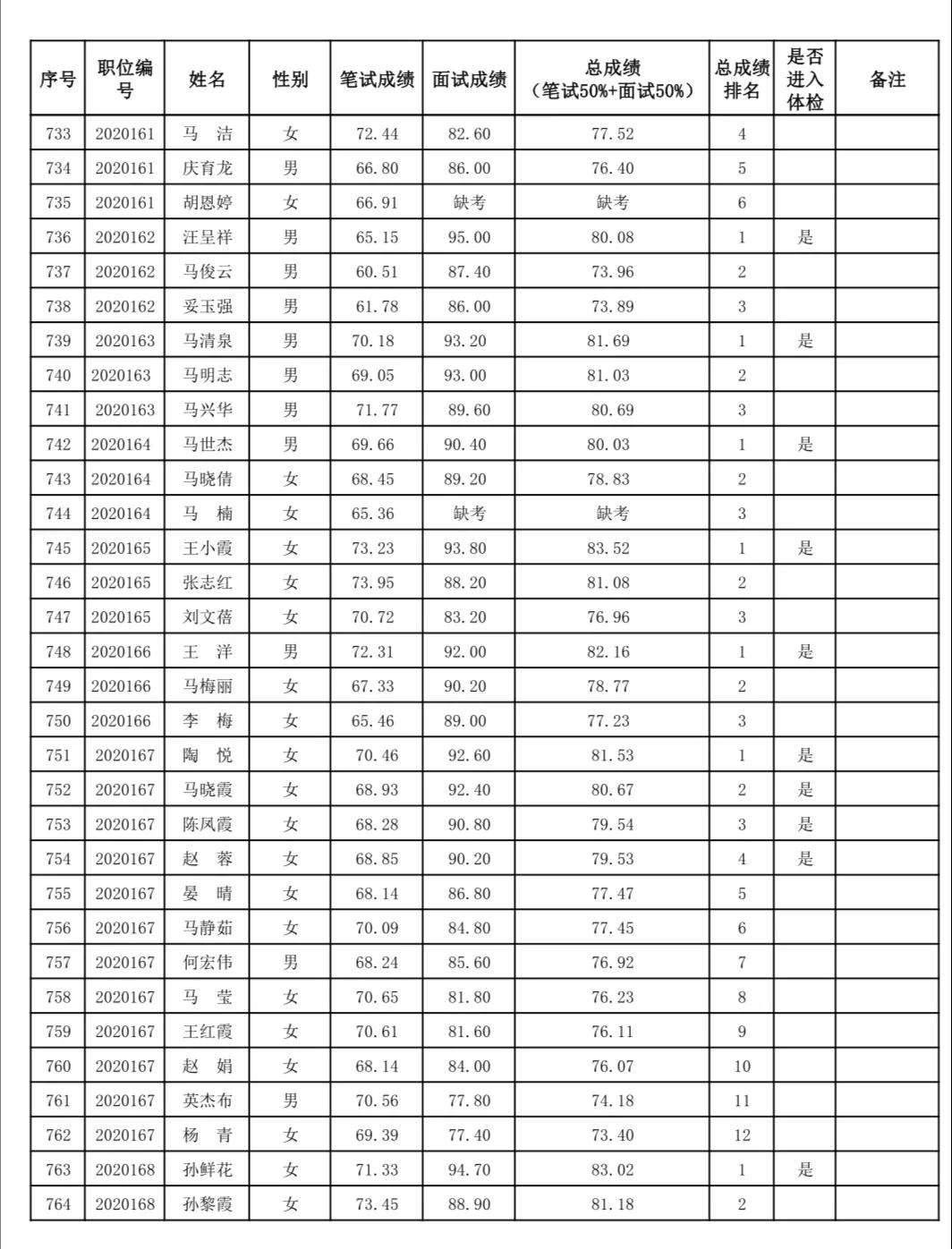 2020年甘肃省检察机关公开招聘聘用制书记员已完成笔试、资格复审、面试等环节,按照《招聘公告》规定,应试人员的总成绩计算公式为:总成绩=笔试成绩×50%+面试成绩×50%( 最终成绩保留小数点后两位),根据总成绩由高到低的次序,等额确定进入体检环节人选。