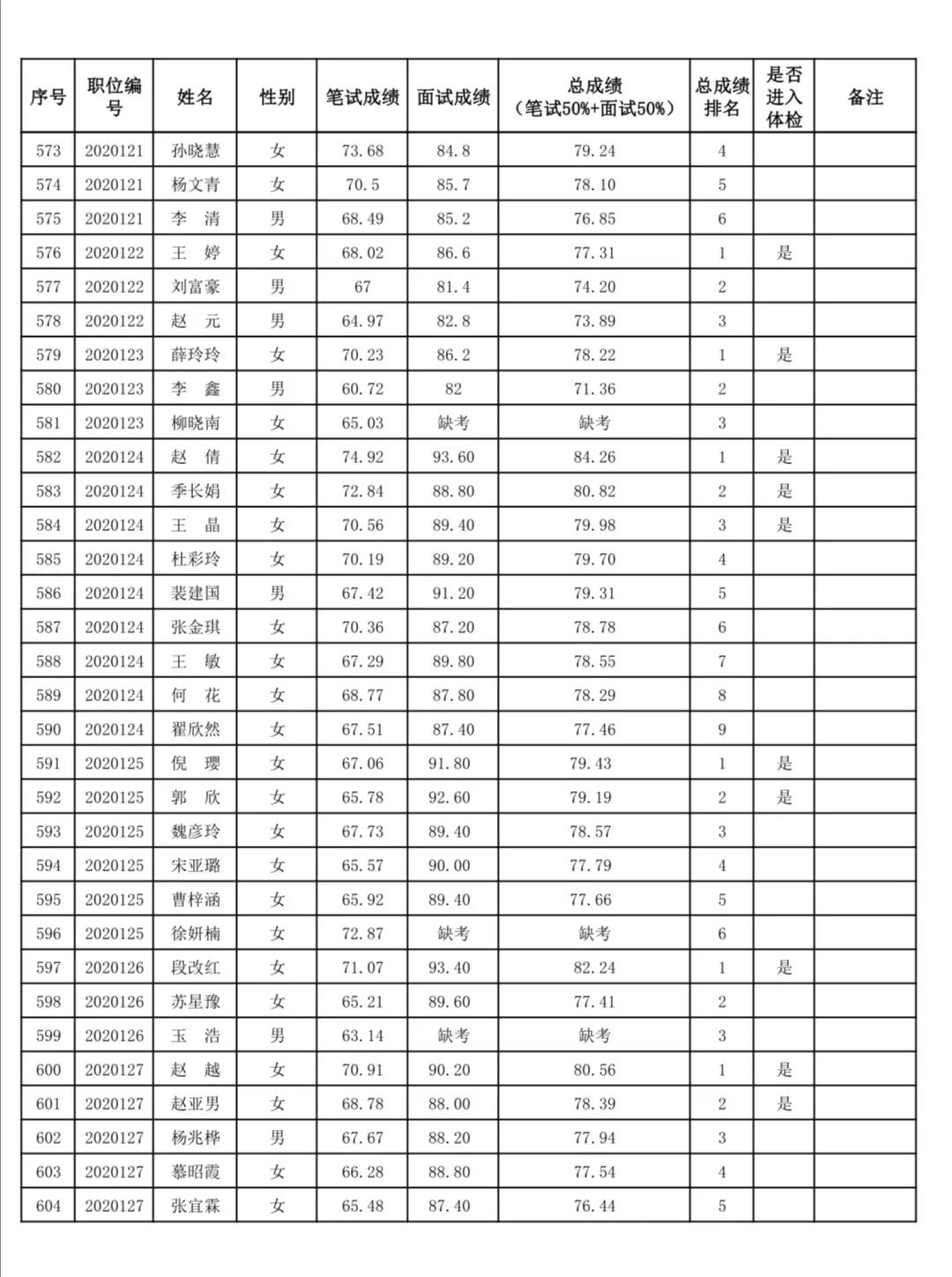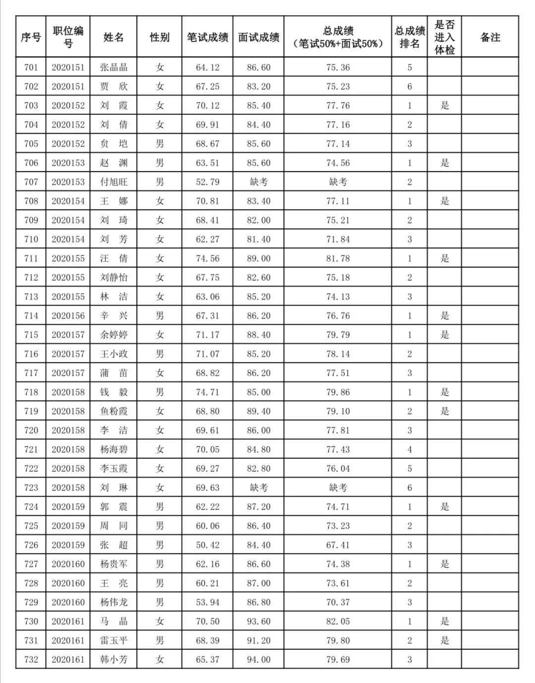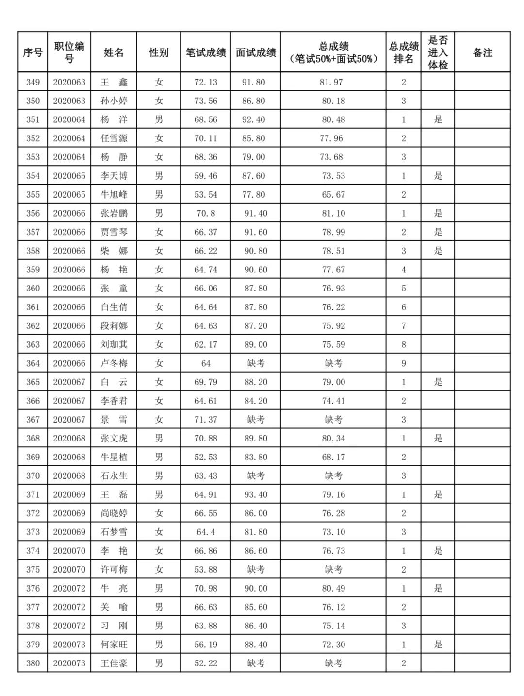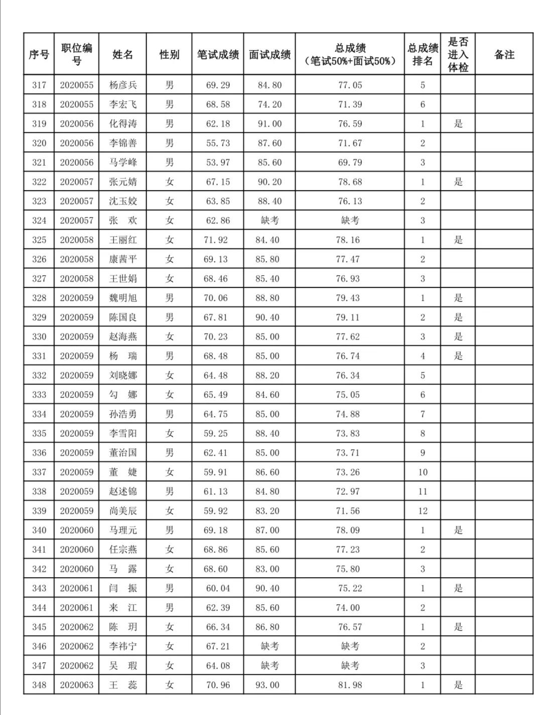 2020年甘肃省检察机关公开招聘聘用制书记员已完成笔试、资格复审、面试等环节,按照《招聘公告》规定,应试人员的总成绩计算公式为:总成绩=笔试成绩×50%+面试成绩×50%( 最终成绩保留小数点后两位),根据总成绩由高到低的次序,等额确定进入体检环节人选。