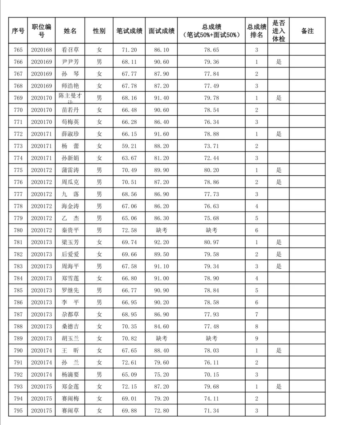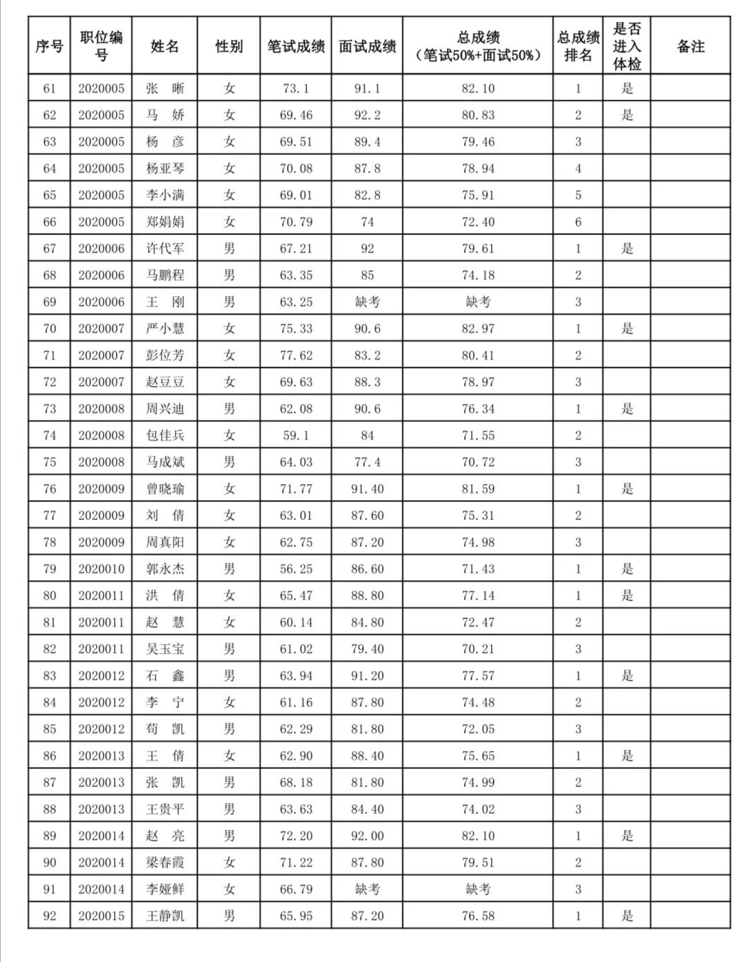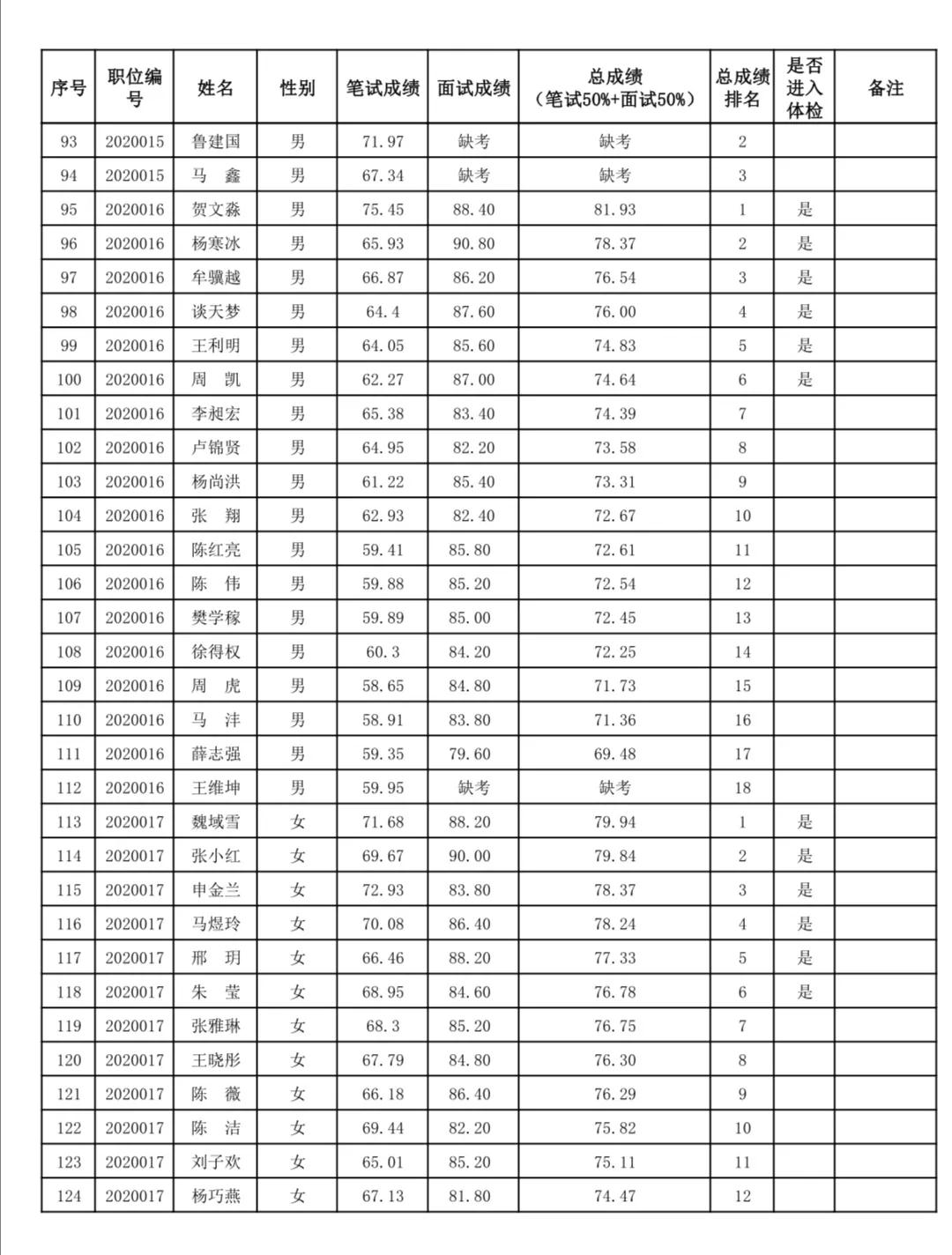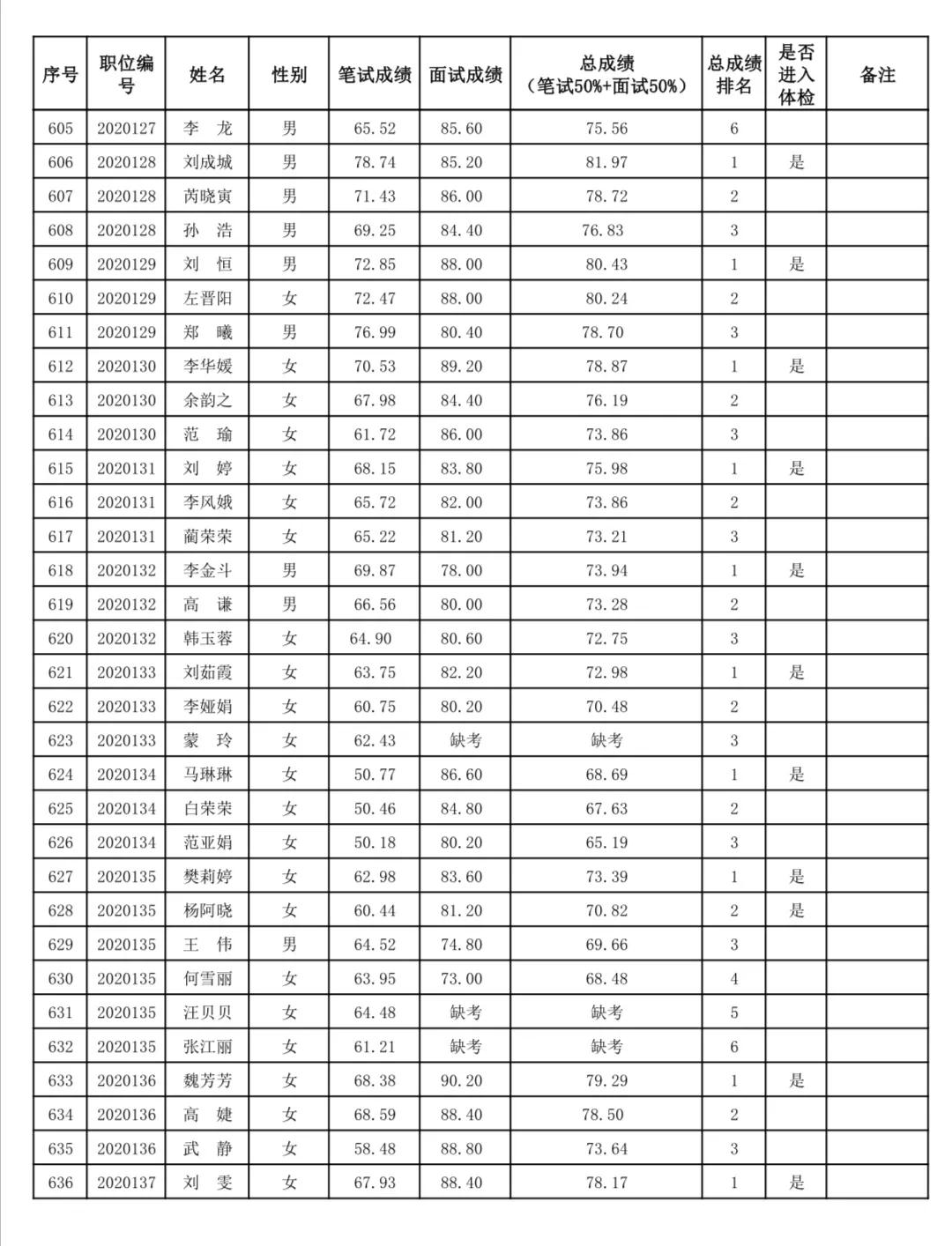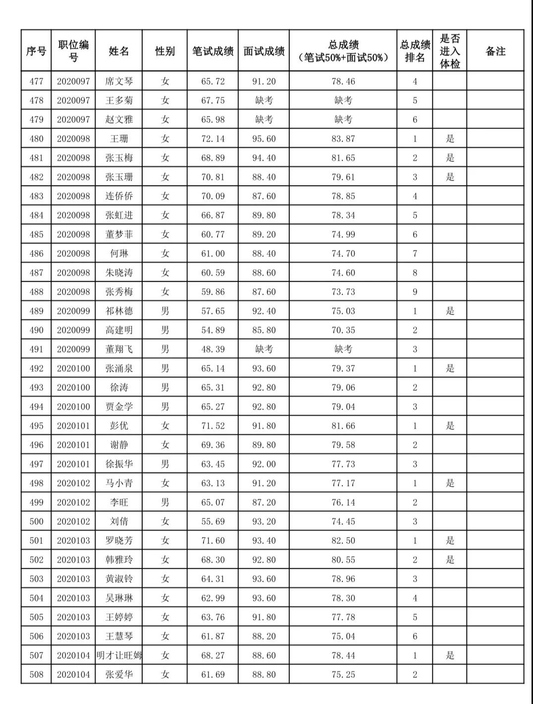 2020年甘肃省检察机关公开招聘聘用制书记员已完成笔试、资格复审、面试等环节,按照《招聘公告》规定,应试人员的总成绩计算公式为:总成绩=笔试成绩×50%+面试成绩×50%( 最终成绩保留小数点后两位),根据总成绩由高到低的次序,等额确定进入体检环节人选。
