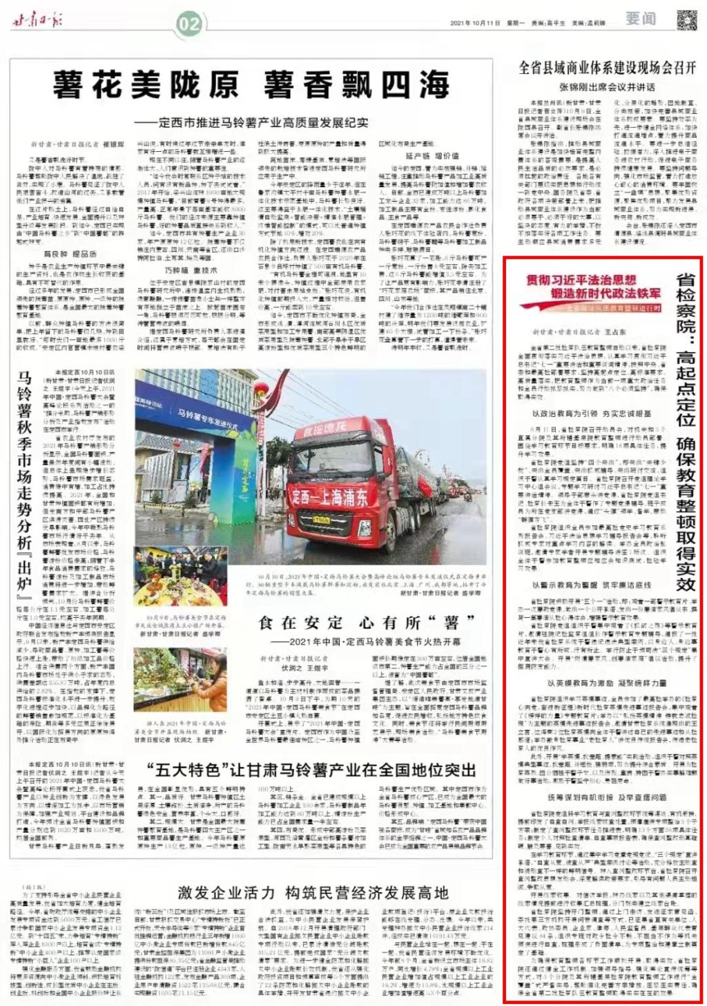 2021年10月11日,甘肃日报二版刊发新闻《省检察院:高起点定位 确保教育整顿取得实效》。