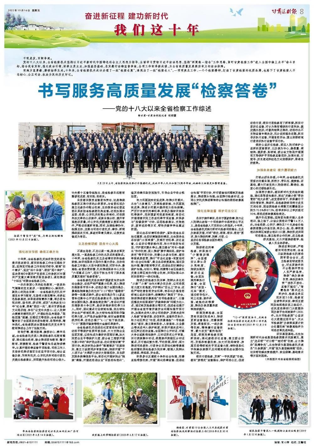 2022年10月14日,甘肃法制报八版刊发《书写服务高质量发展“检察答卷”——党的十八大以来全省检察工作综述》。