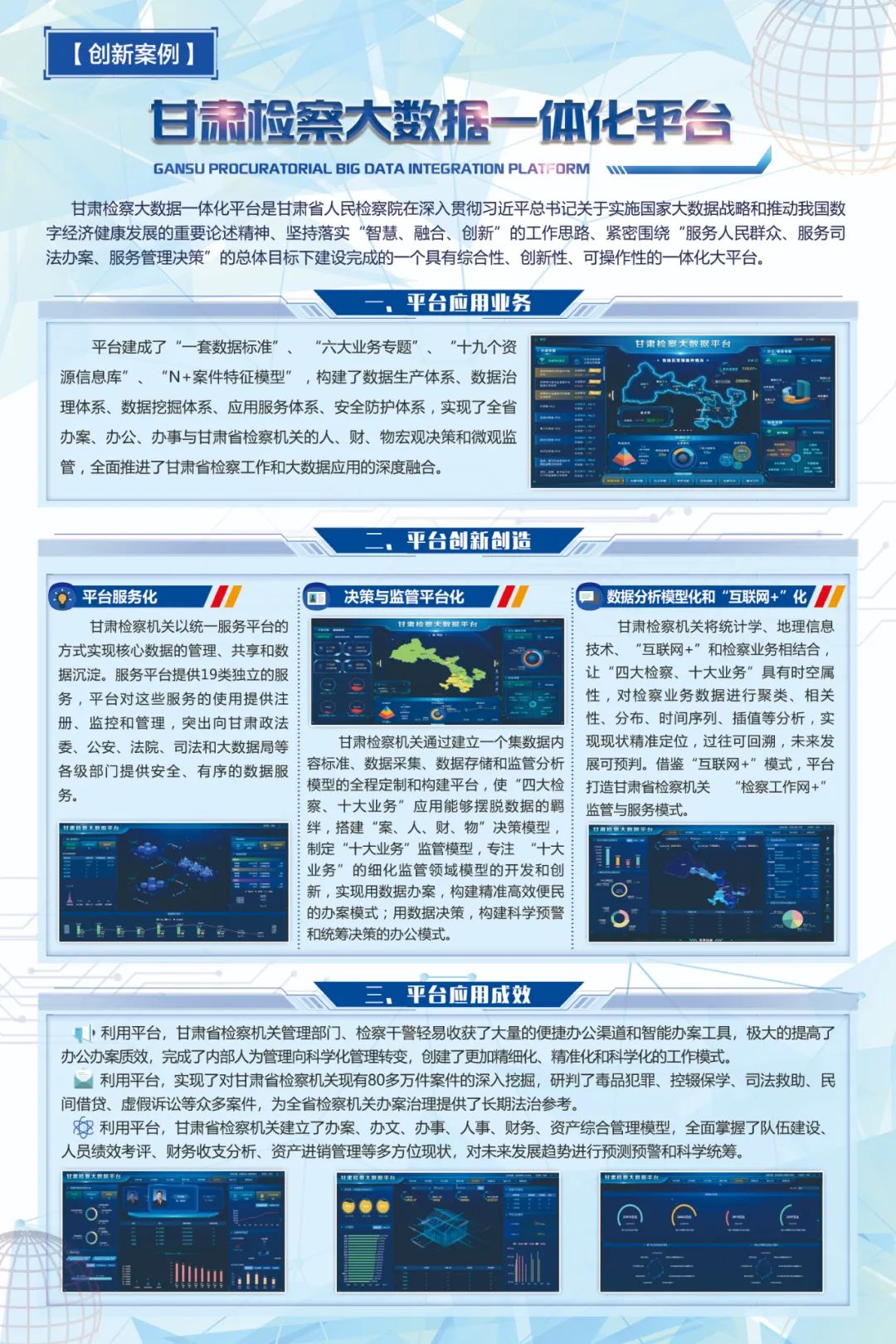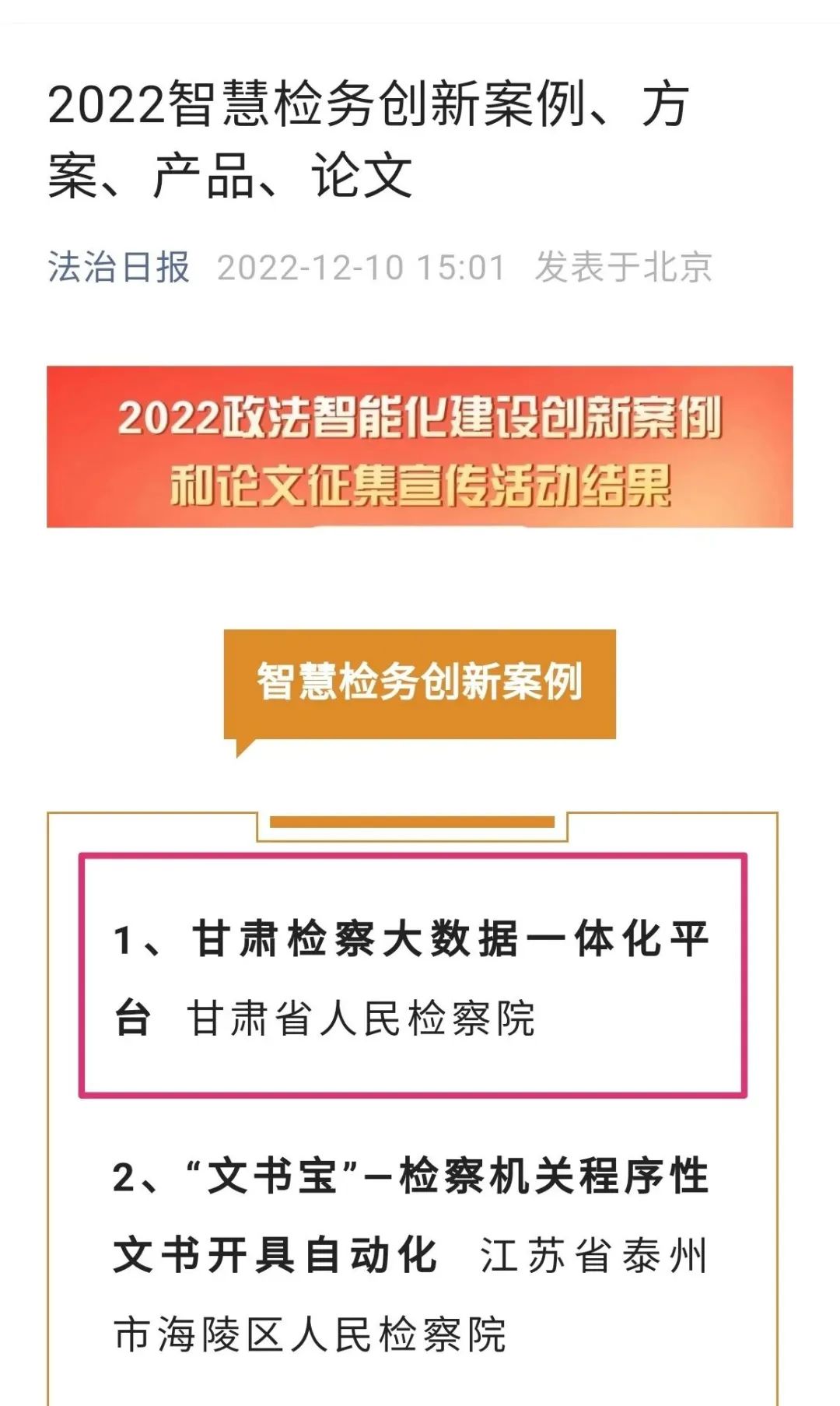 近日,由法治日报社举办的“2022政法智能化建设创新案例和论文”评选结果出炉,甘肃检察大数据一体化平台获评“智慧检务创新案例”,位列第一。