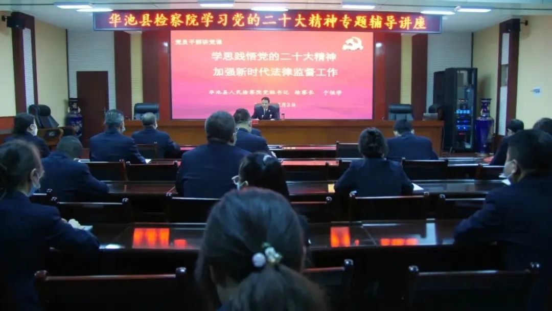 华池县检察院党组书记、检察长于恒学以“学思践悟党的二十大精神,加强新时代法律监督工作”为主题,结合检察工作实际,分享学习党的二十大精神的心得体会和感悟,并重点围绕党的二十大主题、过去5年的工作和新时代10年的伟大变革、马克思主义中国化时代化等七个方面,对党的二十大精神进行了系统阐释和解读。