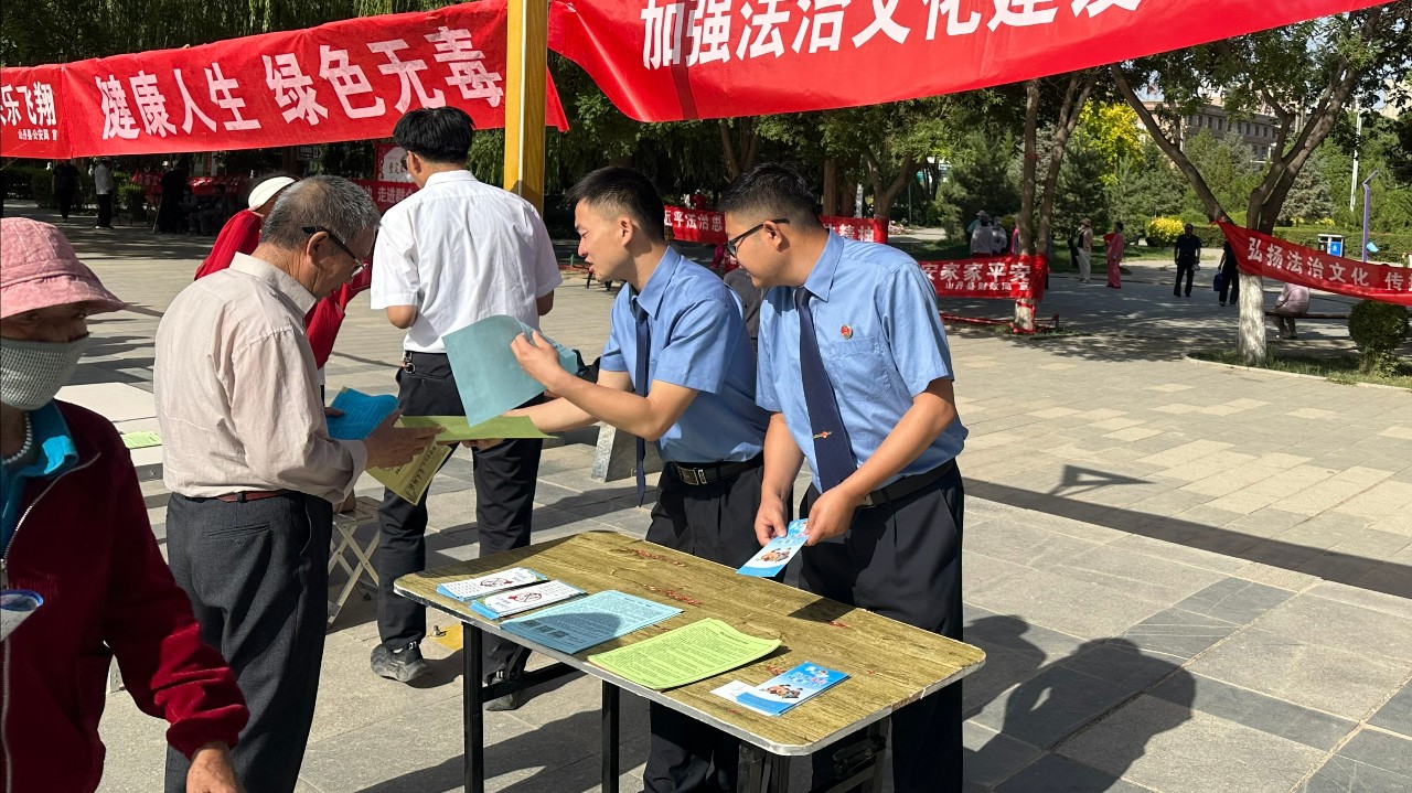 山丹县检察院干警在龙首广场向过往行人讲解了《中华人民共和国禁毒法》《戒毒条例》等相关法律法规,告诫广大居民朋友要谨慎交友、有警觉戒备意识,不轻易和陌生人搭讪,不接受陌生人提供的香烟和饮料及食品。