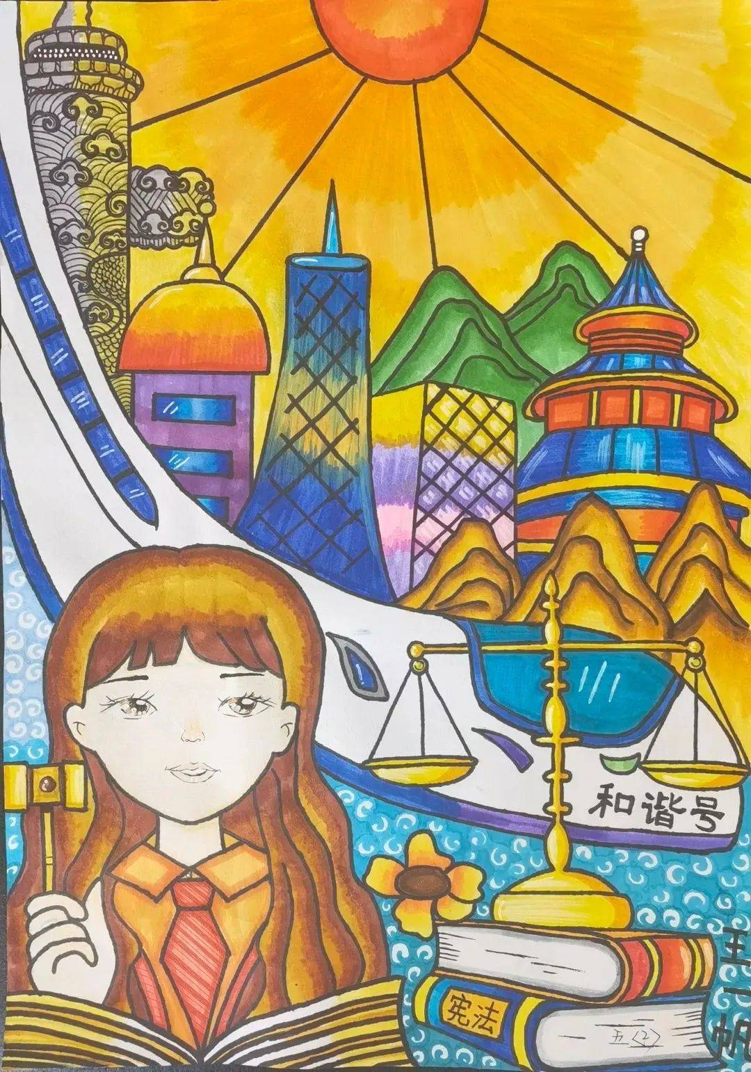 你看,在那束金灿灿的阳光下,在庄严的华表旁,是一列疾驰而过的和谐号,载着我们去想去的地方,一路都是绿水青山,目的地有摩天大楼、有名胜古迹,还有我家乡美丽自然景观——七彩丹霞。这美好幸福的一切都离不开法律,作为一名新时代少先队员,我们要懂得崇尚法律、遵守法律、学习法律、运用法律,让法治伴随着我们健康成长,让我们在法律知识在浇灌下,长成参天大树!