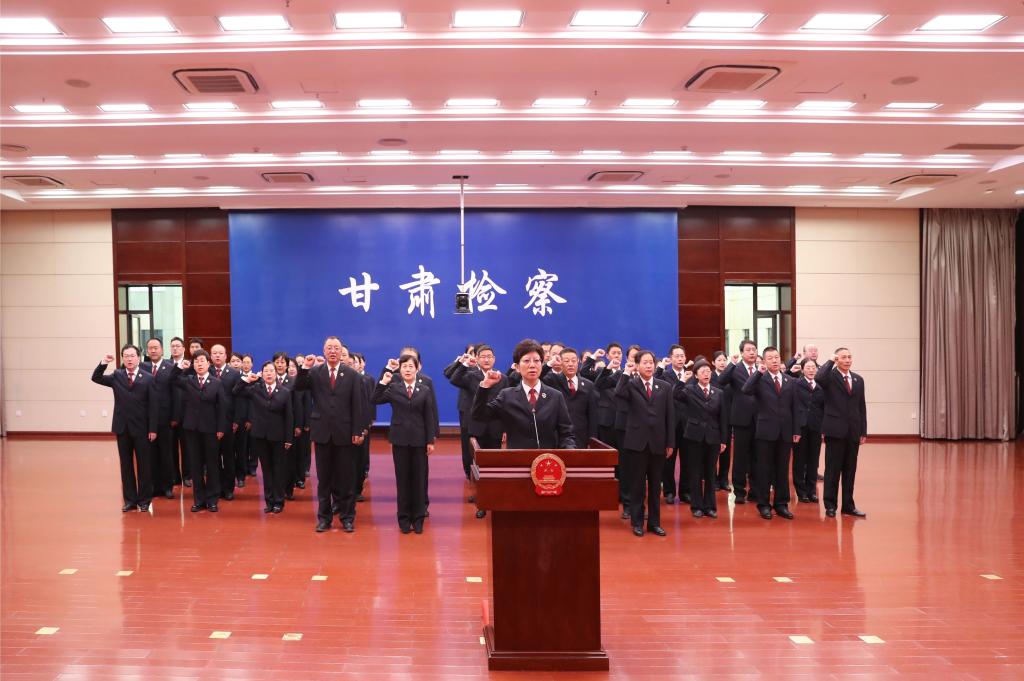 举行宪法宣誓仪式。当天上午9时30分,省检察院党组成员、副检察长张学军宣布宪法宣誓仪式正式开始,全体宣誓人员面对国旗肃立,行注目礼迎接国旗入场,并齐声高唱《中华人民共和国国歌》。随后,省检察院党组副书记、副检察长丁霞敏抚按《宪法》,带领省检察院机关干警举拳庄严宣誓。
