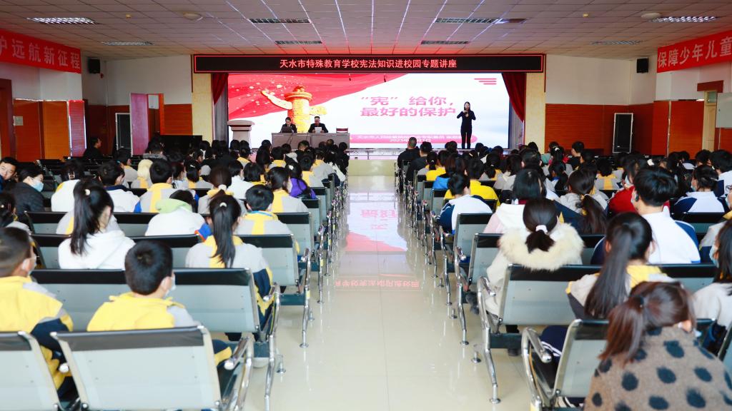 天水市检察院检察官到市特殊教育学校开展“‘宪’给你 最好的保护”法治宣传讲座,为大家讲解宪法知识,大家纷纷表示要树立法治意识,遵守法律法规,做社会主义法治的忠实崇尚者、自觉遵守者、坚定捍卫者。