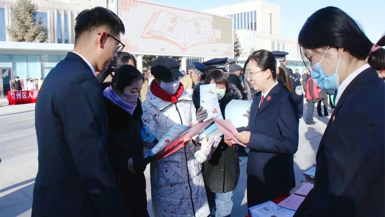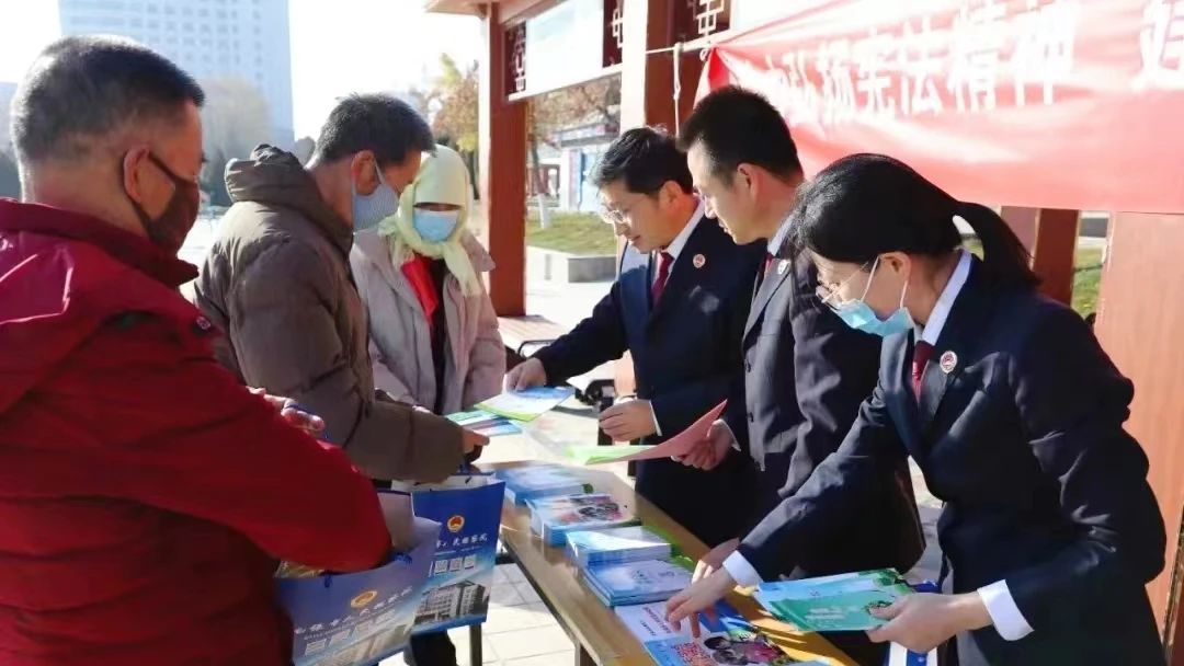 张掖市检察院组织干警参加宪法日集中宣传活动,通过摆放宣传展板,发放民法典和主动创稳、优化营商环境等内容宣传材料,并积极向群众释法说理,进一步增强群众法治观念。