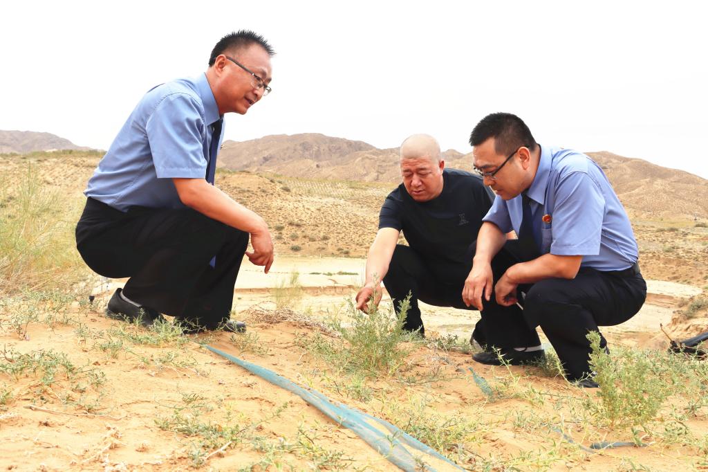2023年8月19日,景泰县检察院办案检察官实地查看被破坏沙化土地封禁保护区整改情况,发现沟渠已回填平整,开挖区域植被已重新种植且成活率显著提高。