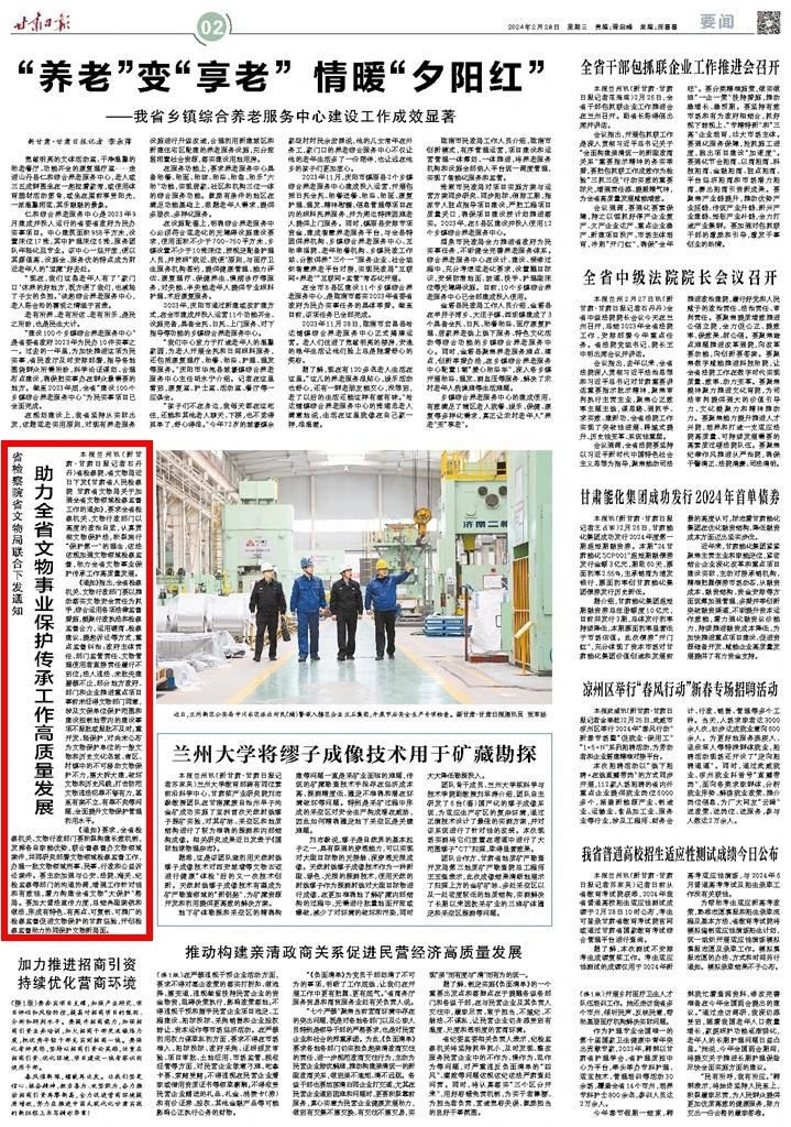 2024年2月28日,甘肃日报刊发《省检察院省文物局联合下发通知 助力全省文物事业保护传承工作高质量发展》。