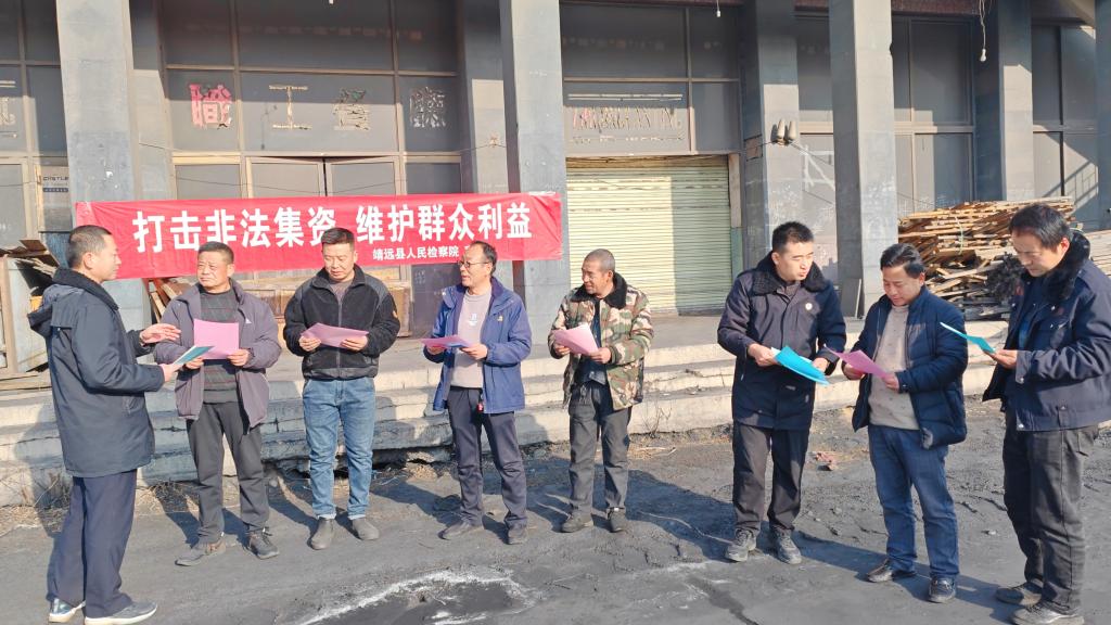 靖远县检察院组织干警深入东湾镇一民营煤场,面对面向工人宣传防范和打击非法集资相关法律政策,详细讲解非法集资的行为特征、表现形式和常见手段,揭露非法集资的社会危害性,引导广大群众树立正确理财观念,远离非法集资。