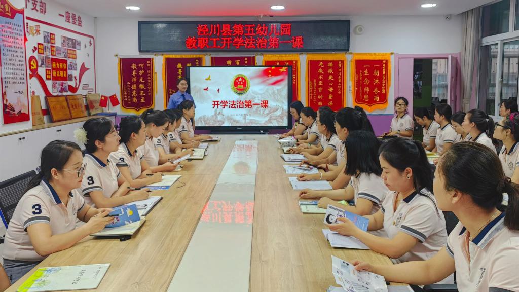 泾川县检察院到县第五幼儿园,为全园50余名教职员工送上“开学法治第一课”。检察干警通过案例分析、法律条文讲解、观看警示教育片等方式,就“一号检察建议”背景和内容、“涉未成年人典型案例”“如何保护和预防未成年人违法犯罪”等内容进行讲解,引导教职员工树立全员、全程、全面保护的理念,增强保护未成年人的意识,提升保护未成年人的能力。