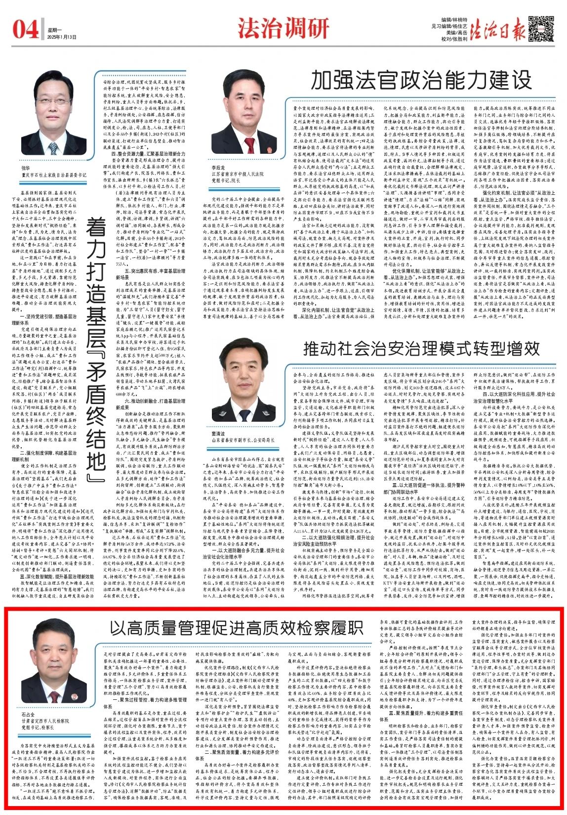 2025年1月13日,法治日报刊发甘肃省定西市人民检察院党组书记、检察长石占全撰写的文章《以高质量管理促进高质效检察履职》。