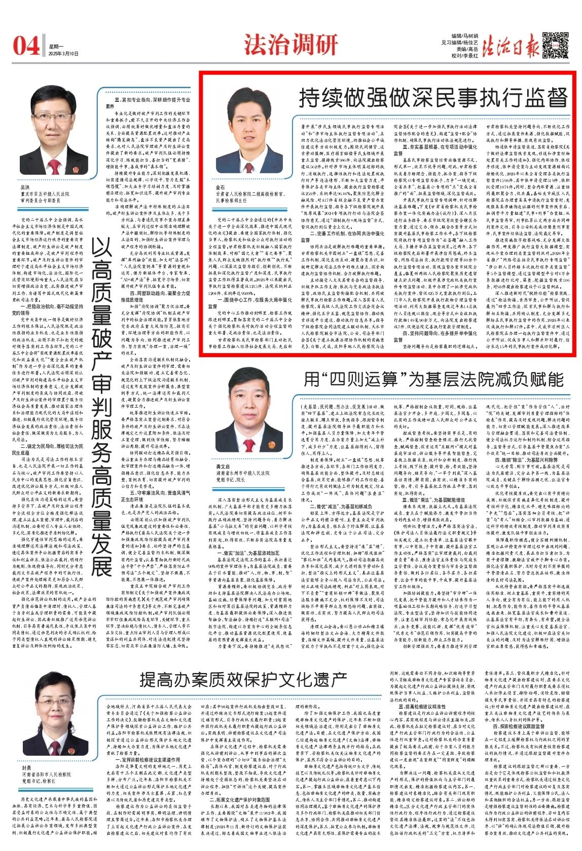2025年3月10日,法治日报刊发理论文章《持续做强做深民事执行监督》。