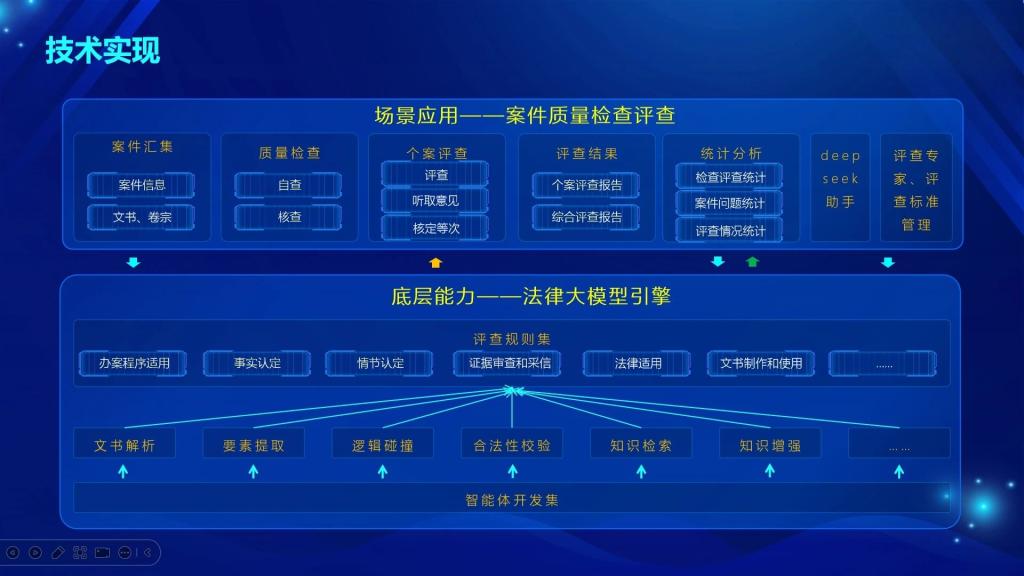 该系统由案件质量检查模块与评查模块组成。案件质量检查模块主要适用于检察官、业务部门对在办案件质量管理,通过规则碰撞,梳理出个案事实认定、证据分析、法律适用等方面问题,提示办案人员及时纠正。案件质量评查模块主要适用于已办结案件,自动推送评查人员予以检查、评定,利用AI大模型的推理能力、语言处理能力、文本生成能力,实现评查报告的自动生成。