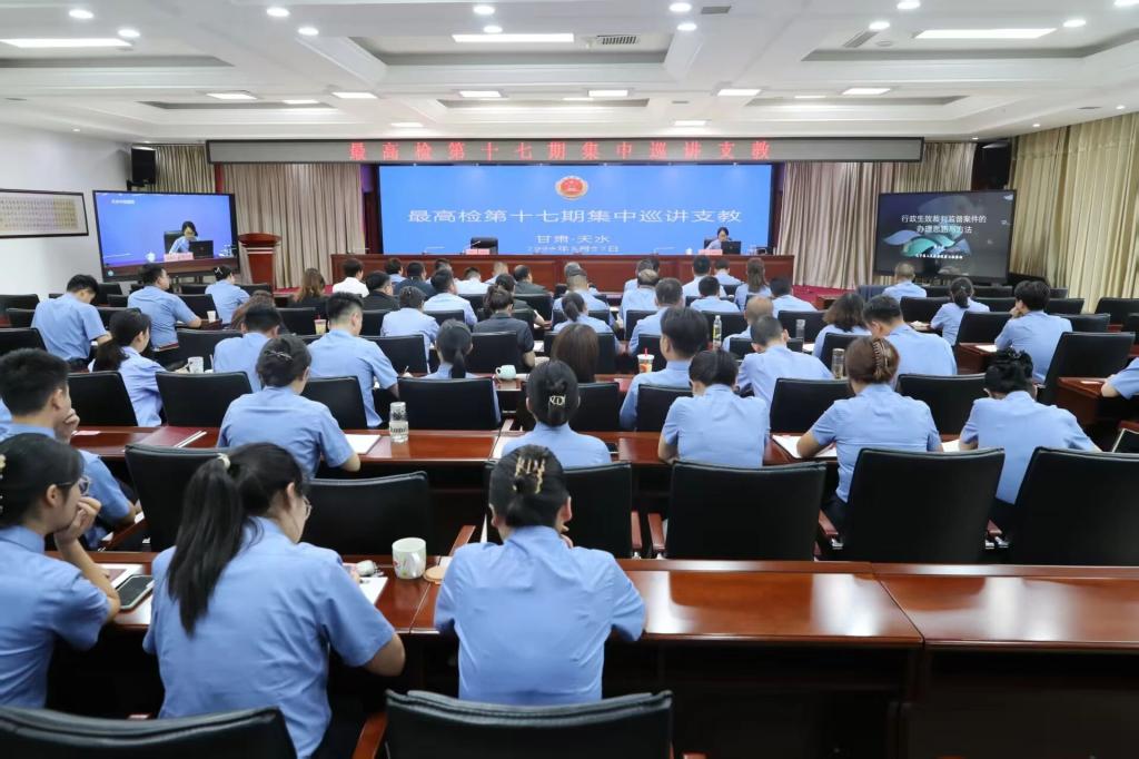 最高检第十七期全国检察教育培训巡讲组在兰州巡讲后,8月27日,风雨兼程奔赴天水市检察机关开展巡讲,辽宁省检察院第七检察部副主任、三级高级检察官国小丹,上海市检察院第一检察部副主任、三级高级检察官周健为干警精彩授课,全省三级检察院干警通过“线上”方式同步聆听。巡讲组其他成员则组成答疑团队,结合检察工作实际及具体案件,为干警们释疑解惑。