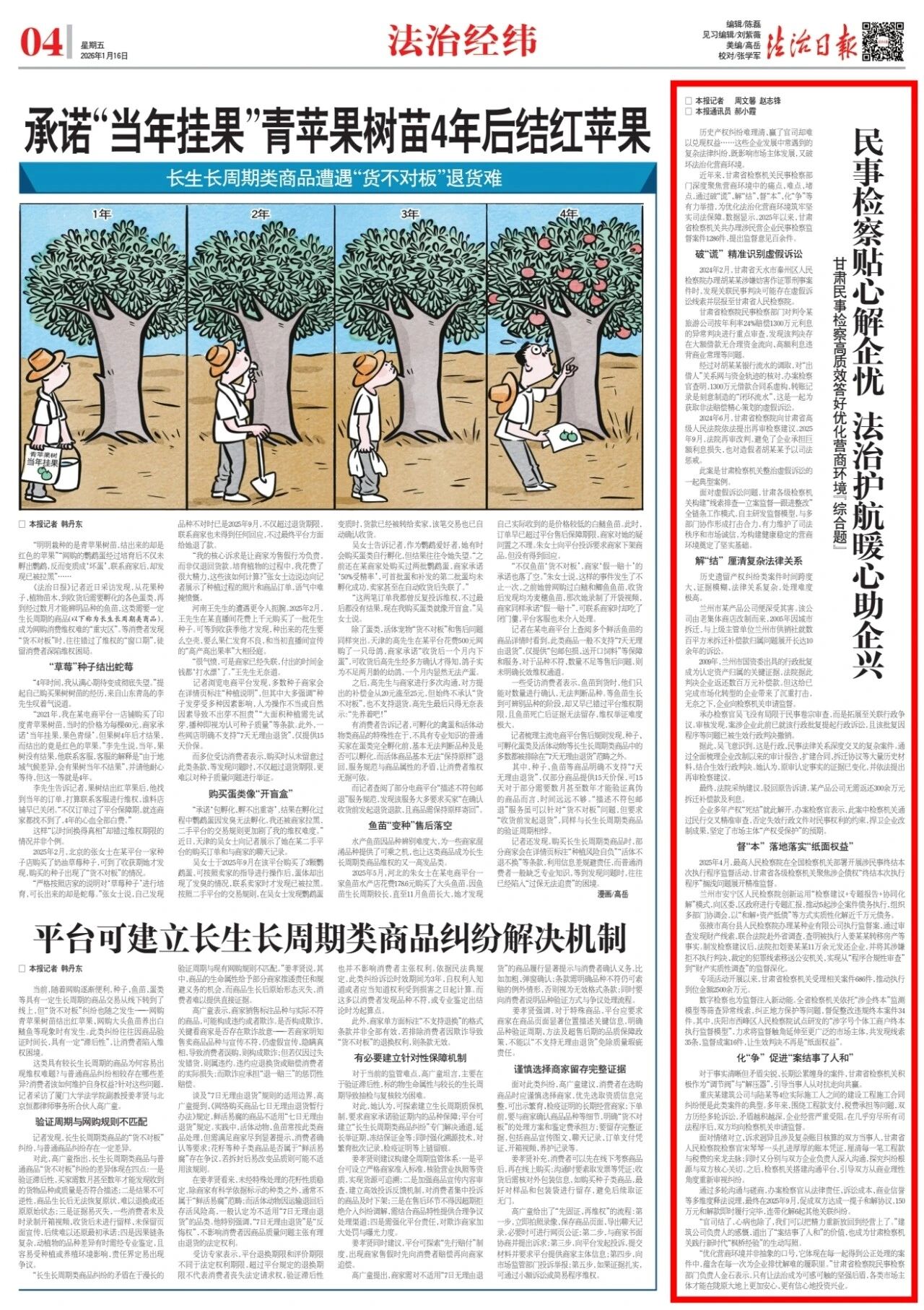 2026年1月16日,法治日报刊发《民事检察贴心解企忧 法治护航暖心助企兴 甘肃民事检察高质效答好优化营商环境“综合题”》。