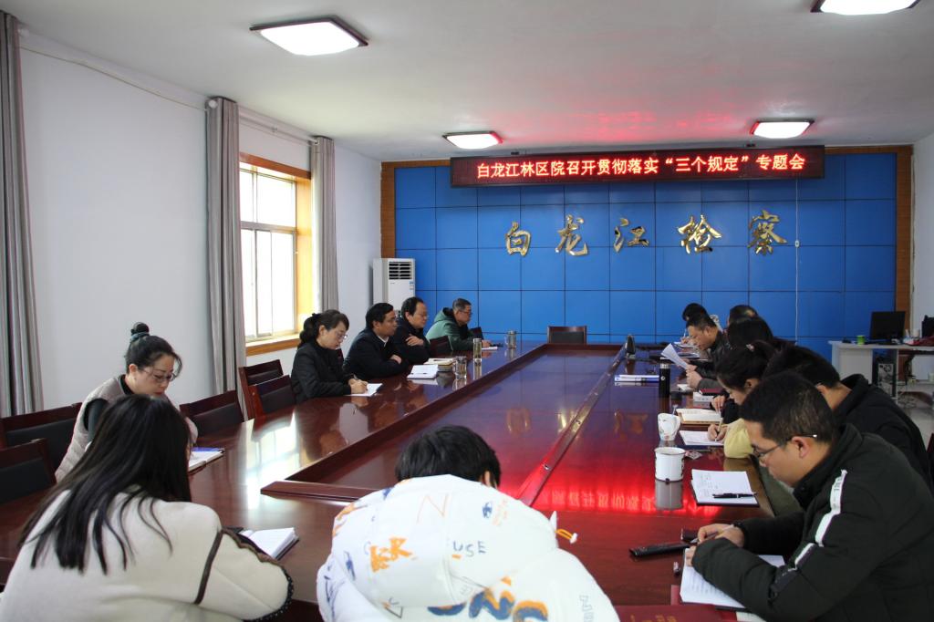 12月9日,白龙江林区院召开贯彻落实省检察院《关于进一步加强“三个规定”等重大事项记录报告制度贯彻落实工作的意见》专题会,全体干警参加会议,该院党组书记、检察长赵阳平主持会议。