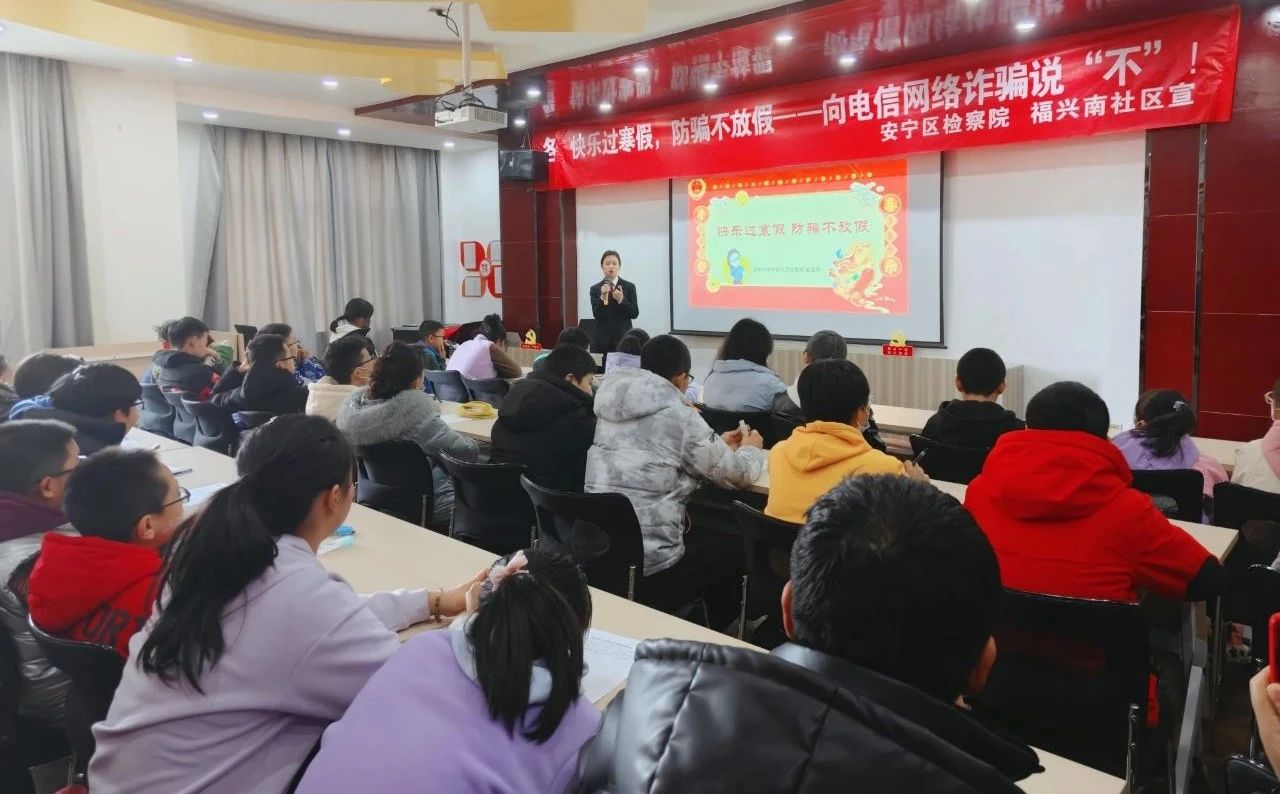 “街道、社区在参与反诈工作中具有根植基层、覆盖面广、贴近未成年人的优势。”为强化防范电信网络诈骗工作合力,兰州市安宁区检察院“南风”未检工作室联合福兴南社区开展“快乐过寒假,防骗不放假——向电信网络诈骗说‘不’”专项活动。
