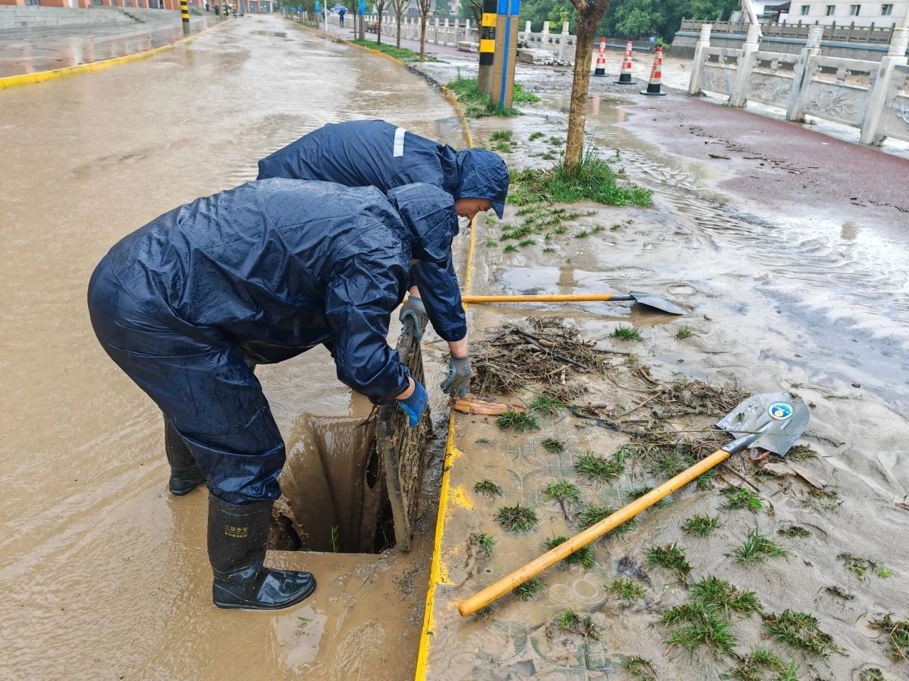 面对路面积水严重、道路无法通行的情况,10余名检察干警组成防汛应急队,奔赴责任片区开展道路积水疏通及清淤工作,清理排水口枯枝落叶、塑料袋、淤泥等堵塞物,利用工具疏通堵塞管道。经过数小时的紧张清理,相关路段堵塞的排水口全部疏通,道路恢复正常通行。