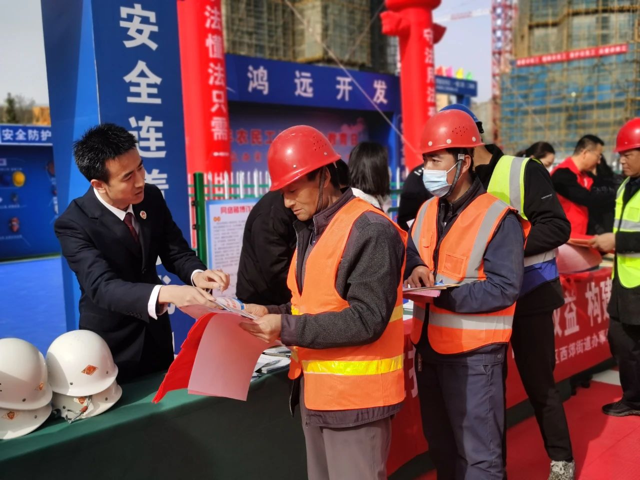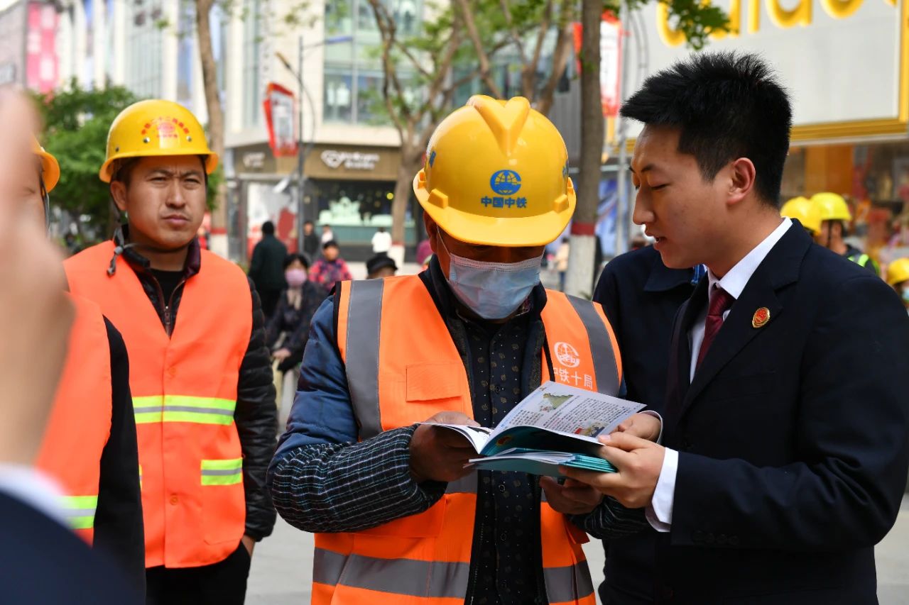 2023年4月10日,平凉市崆峒区检察院干警在某工地开展农民工权益保护法治宣传教育活动。