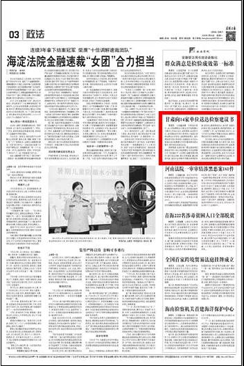 2020年7月20日法制日报刊发《甘肃向14家单位送达检察建议书 》一文。
