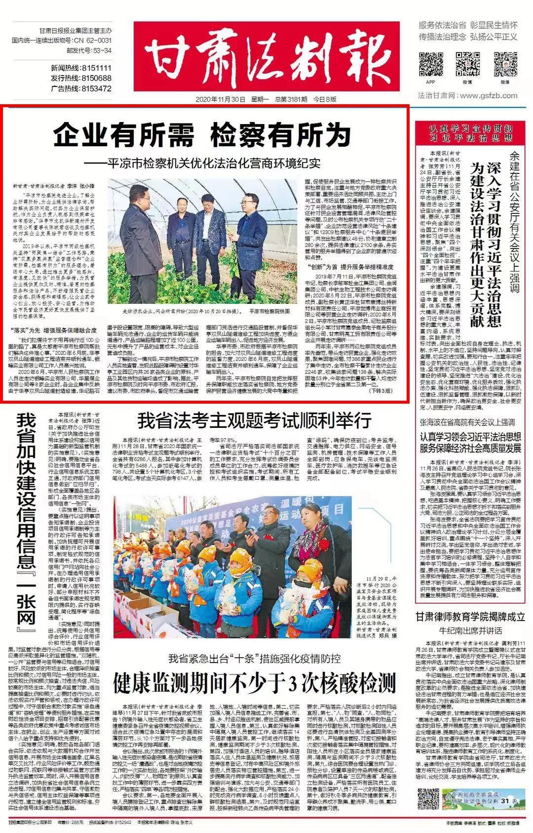 2020年11月30日甘肃法制报头版头条刊发《企业有所需 检察有所为——平凉市检察机关优化法治化营商环境纪实》一文。