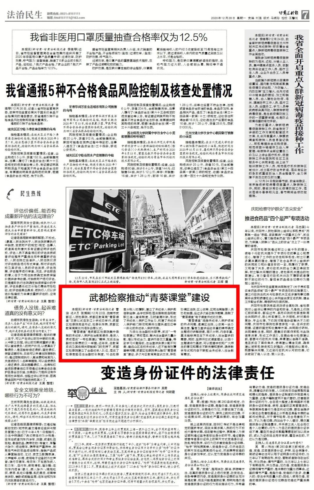 2020年12月28日甘肃法制报刊发《武都检察推动“青葵课堂”建设》一文。