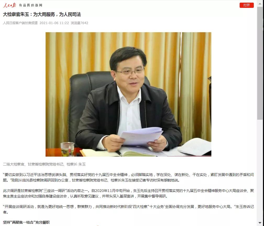 2021年1月6日人民日报客户端发布《大检察官朱玉:为大局服务,为人民司法》一文。