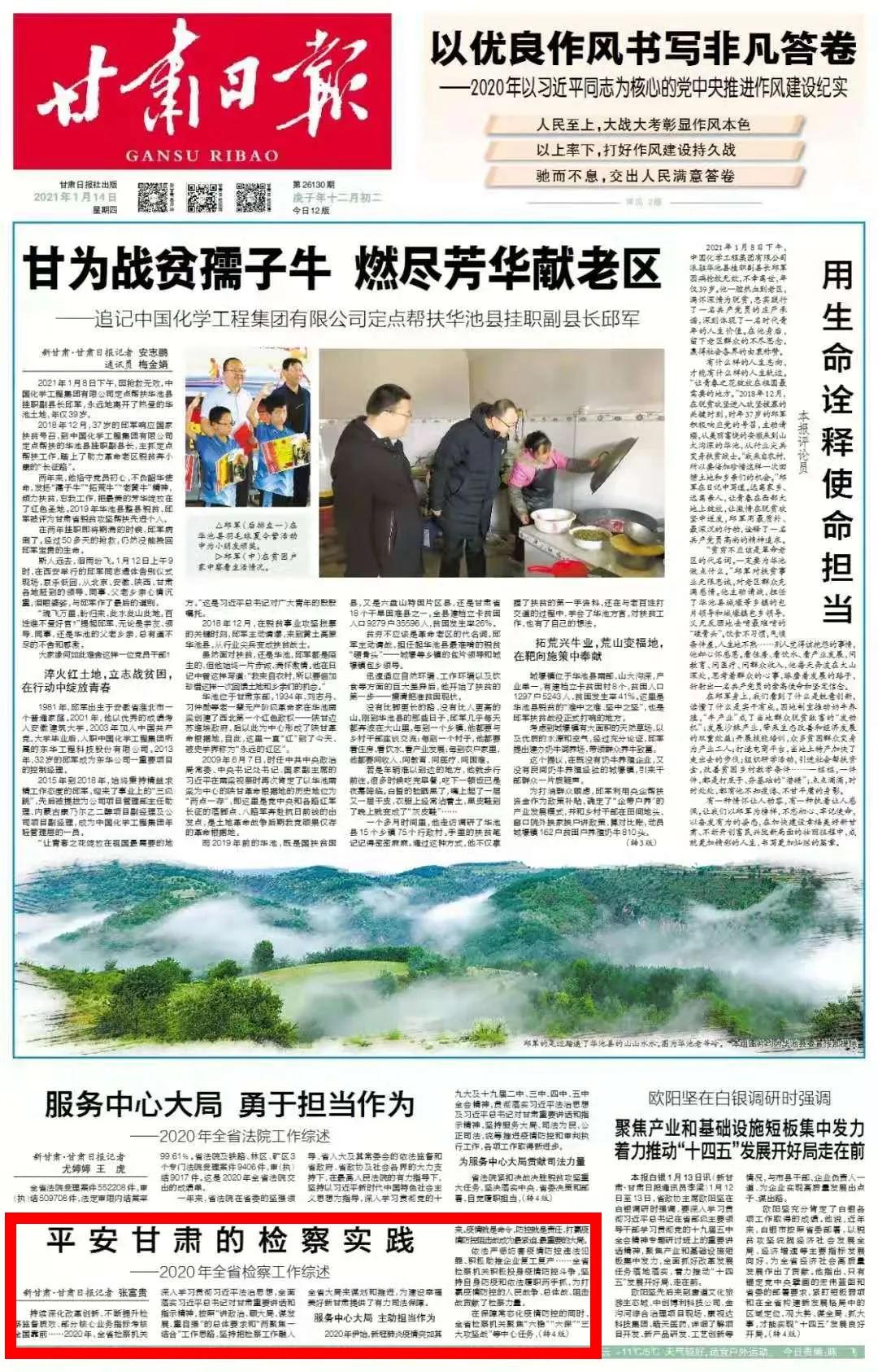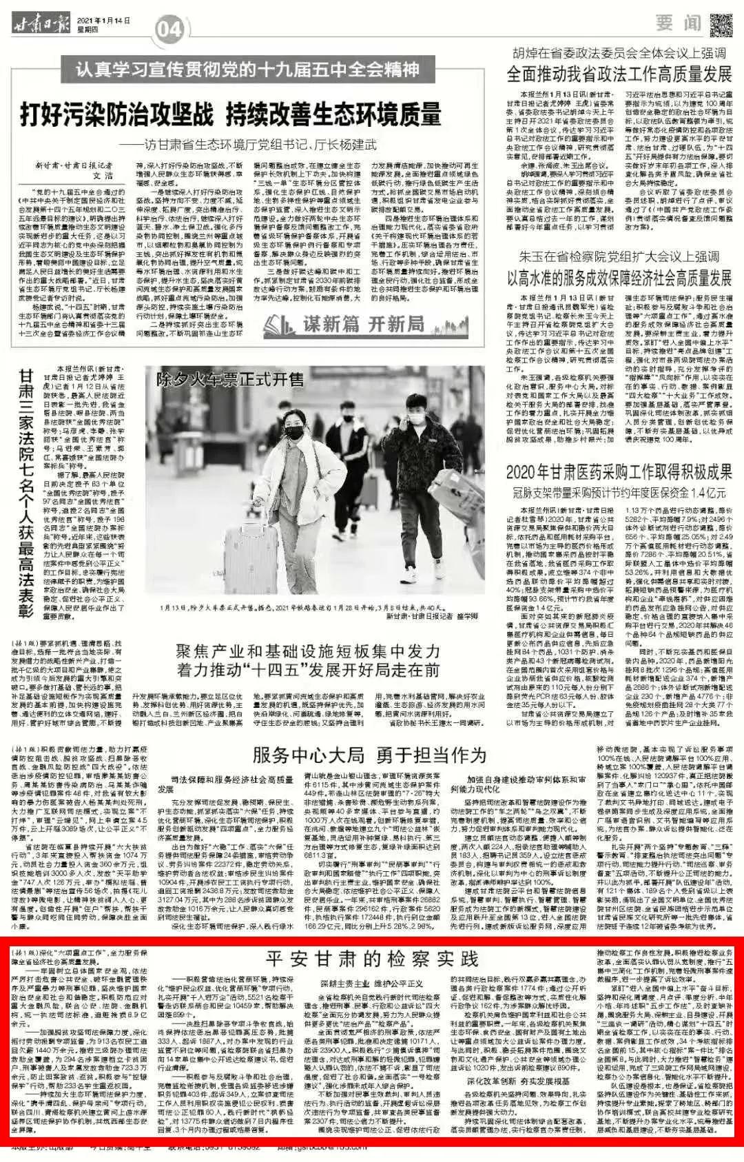 2021年1月6日甘肃日报头版、4版刊发《平安甘肃的检察实践——2020年全省检察工作综述》一文。