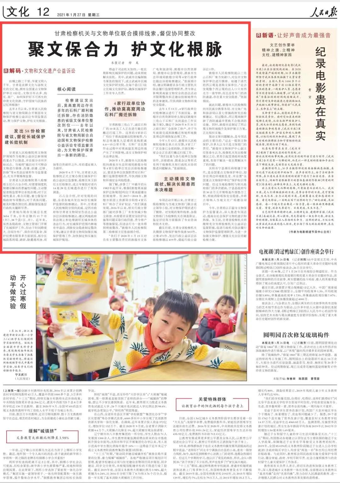 2021年1月27日人民日报十二版刊发《聚文保合力 护文化根脉(解码·文物和文化遗产公益诉讼)——1024核工厂
