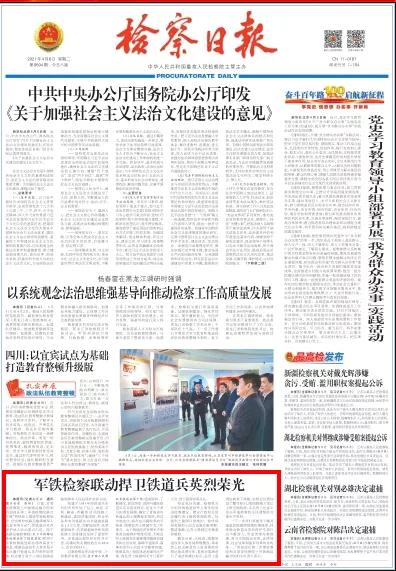 2021年4月6日检察日报头版刊发《军铁检察联动捍卫铁道兵英烈荣光》一文。