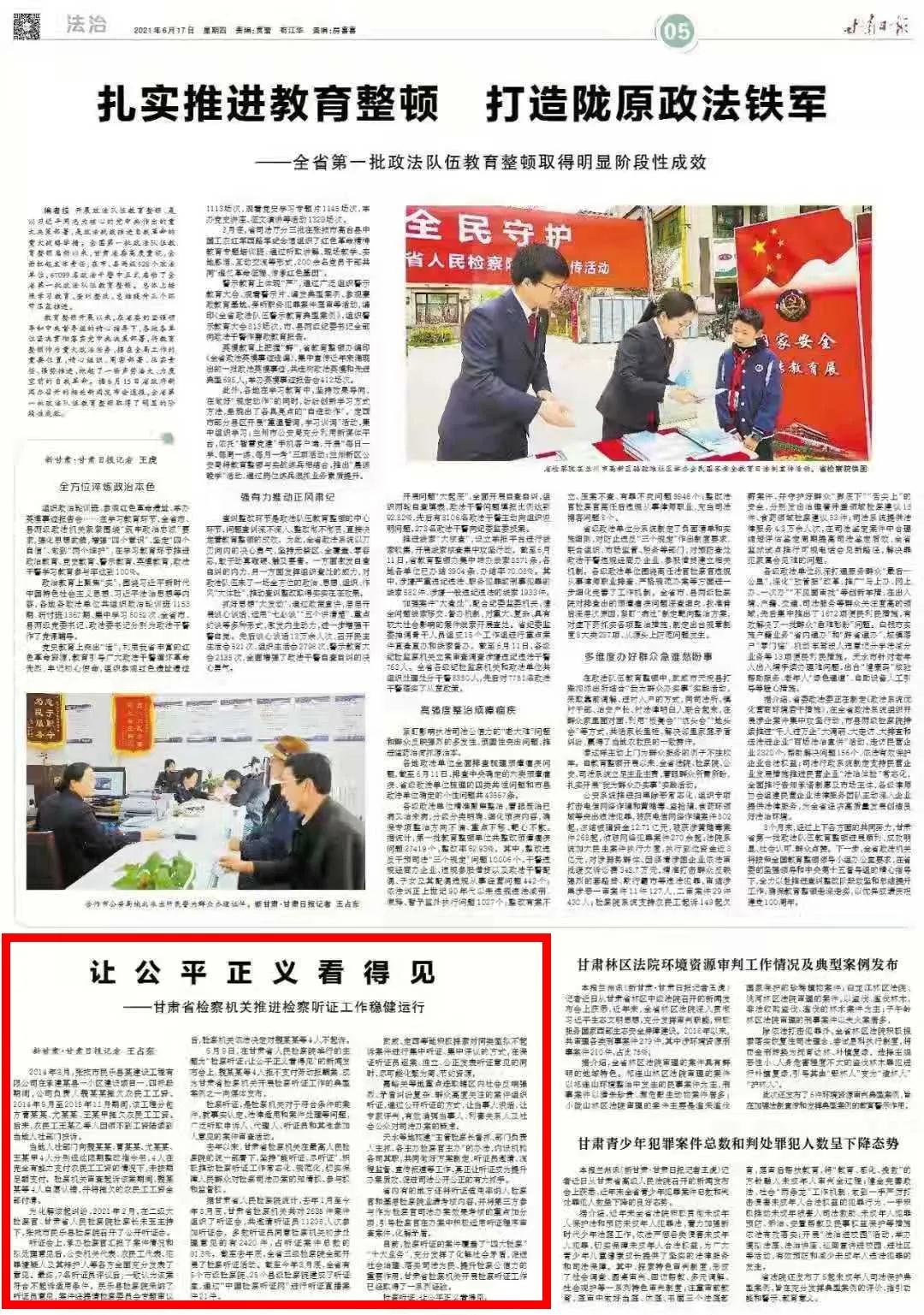 2021年6月17日,甘肃日报五版刊发《让公平正义看得见——甘肃省检察机关推进检察听证工作稳健运行》一文。