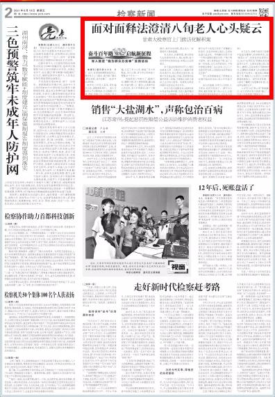 2021年6月18日,检察日报二版刊发《面对面释法澄清八旬老人心头疑云——甘肃大检察官上门接访化解积案》一文。