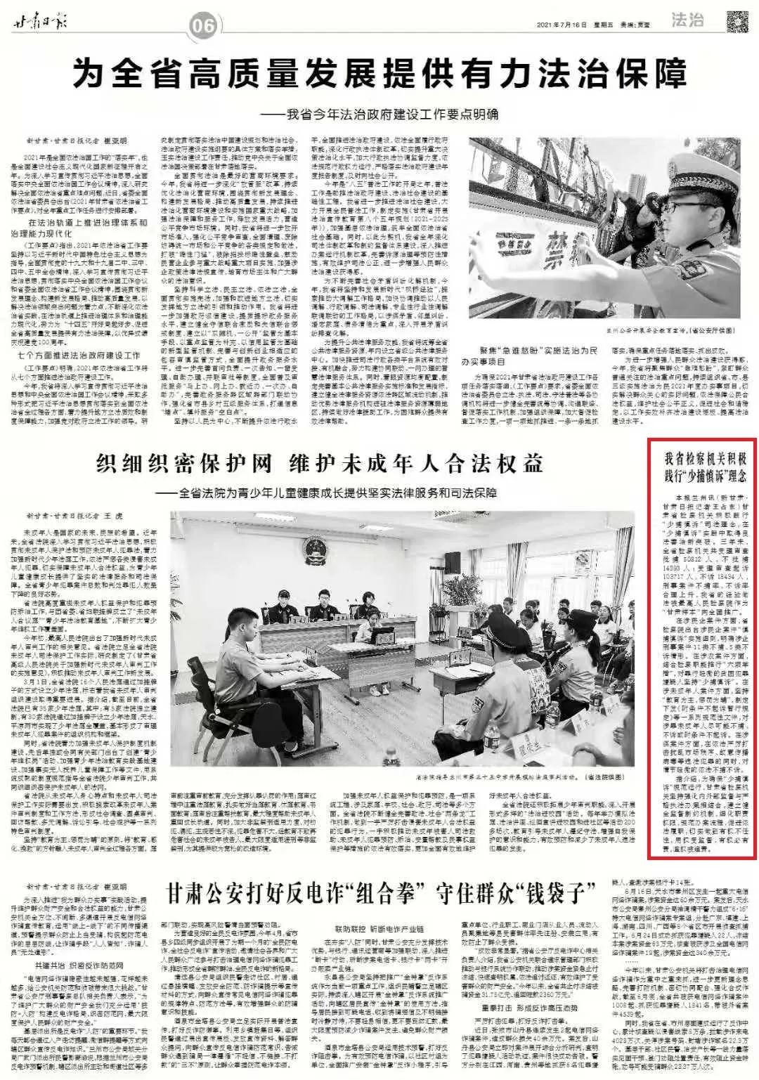 2021年7月16日《甘肃日报》六版刊发《我省检察机关积极践行“少捕慎诉”理念》一文。