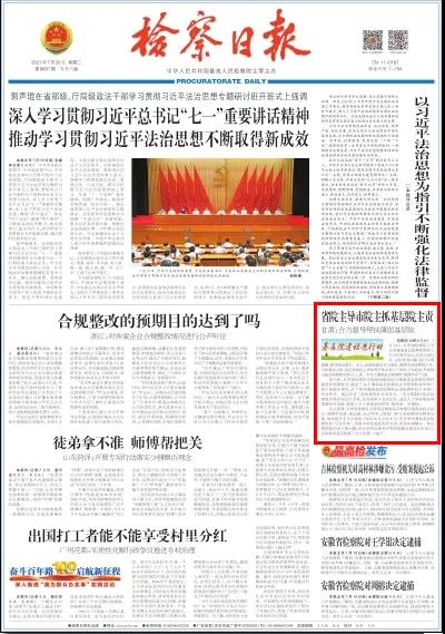 2021年7月20日,《检察日报》头版刊发《省院主导市院主抓基层院主责——甘肃:合力督导帮扶薄弱基层院》一文。