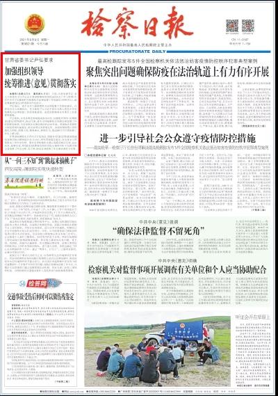 2021年8月9日,检察日报头版头条刊发新闻《甘肃省委书记尹弘要求:加强组织领导 统筹推进《意见》贯彻落实》。