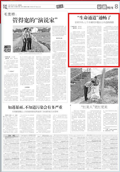 2021年8月19日,检察日报八版刊发新闻《“生命通道”通畅了——甘肃华亭:七个乡镇同步整治公共道路路障》。