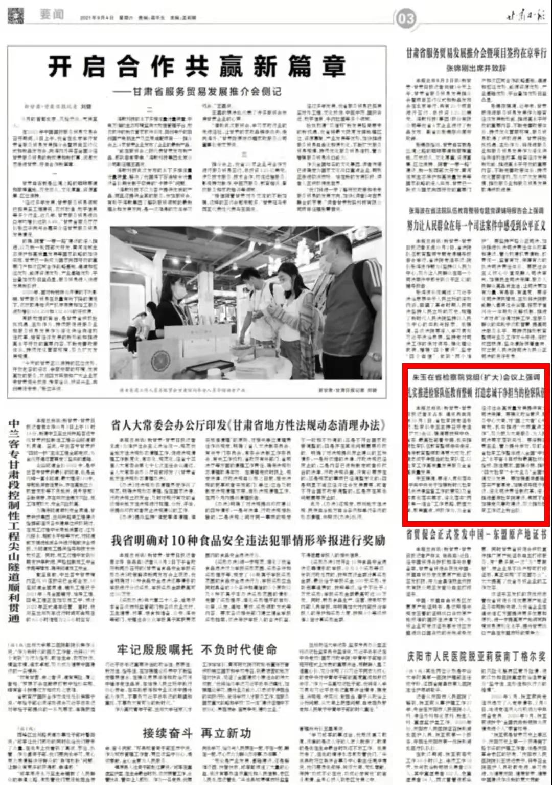 2021年9月4日,甘肃日报三版刊发新闻《朱玉在省检察院党组(扩大)会议上强调:扎实推进检察队伍教育整顿 打造忠诚干净担当的检察队伍》。