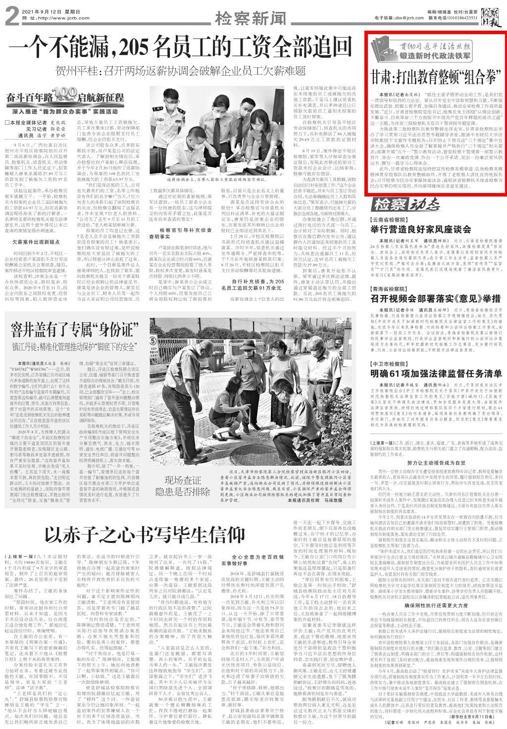 2021年9月12日,检察日报二版刊发新闻《甘肃:打出教育整顿“组合拳”》。