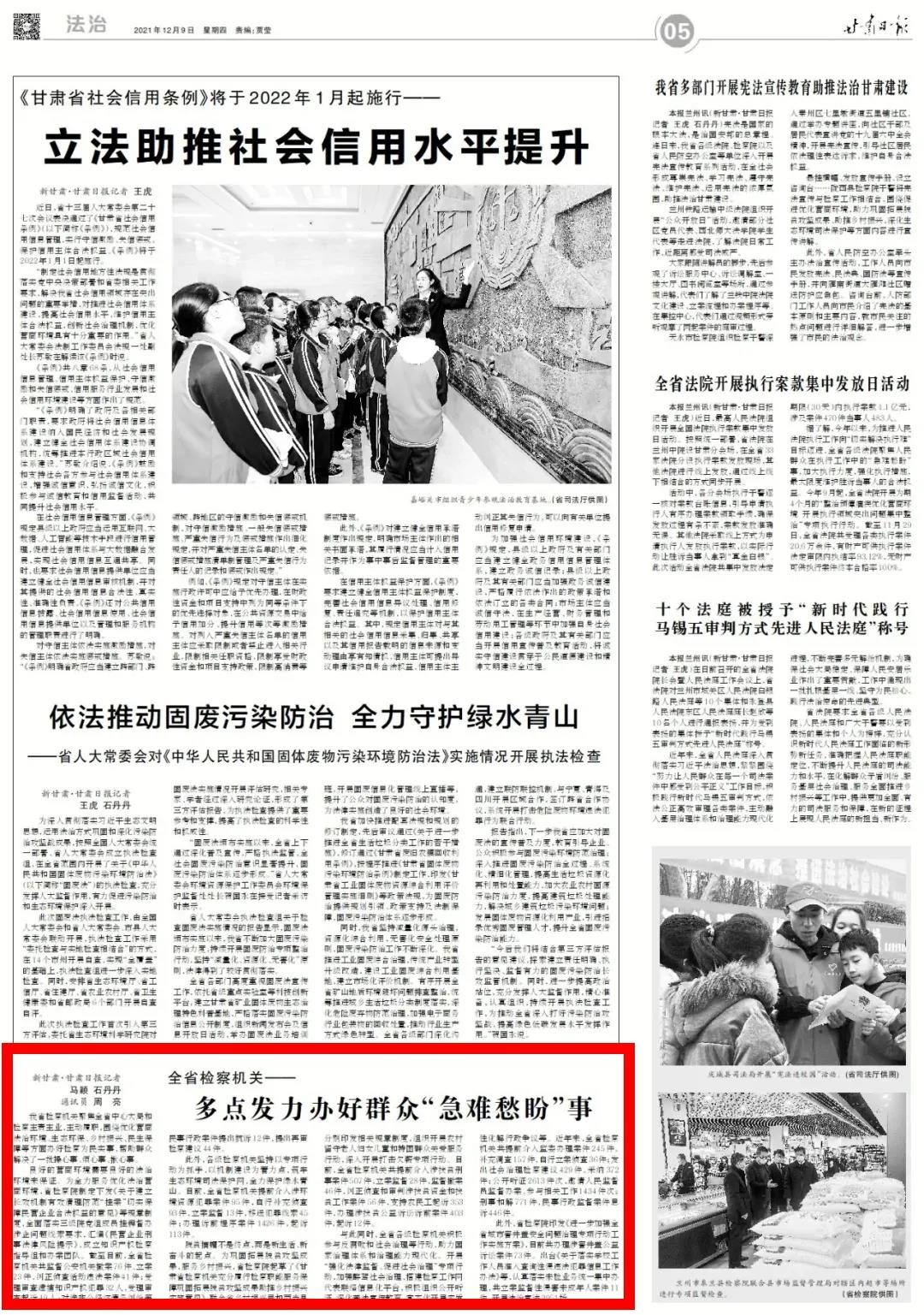 2021年12月9日甘肃日报五版刊发《全省检察机关多点发力办好群众“急难愁盼”事》。