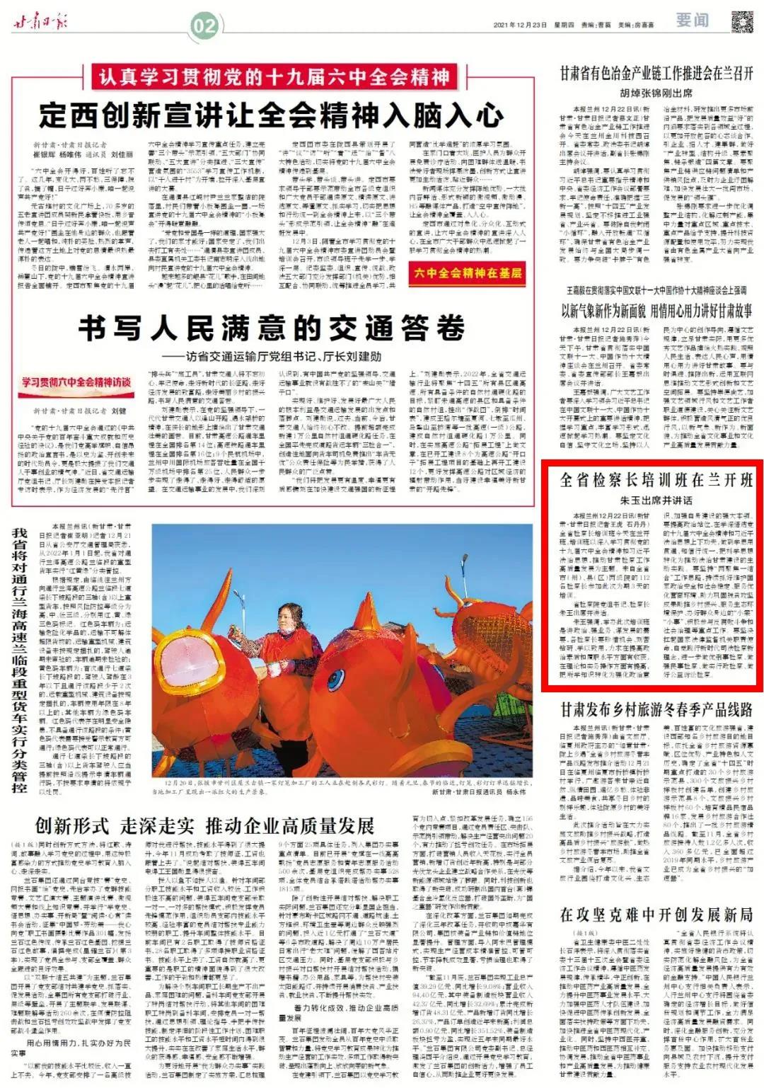 2021年12月23日甘肃日报二版刊发《全省检察长培训班在兰开班 朱玉出席并讲话》。