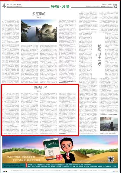 2021年12月26日,检察日报四版刊发甘肃省平凉市崆峒区检察院张旭升的文学作品《上学的儿子》。