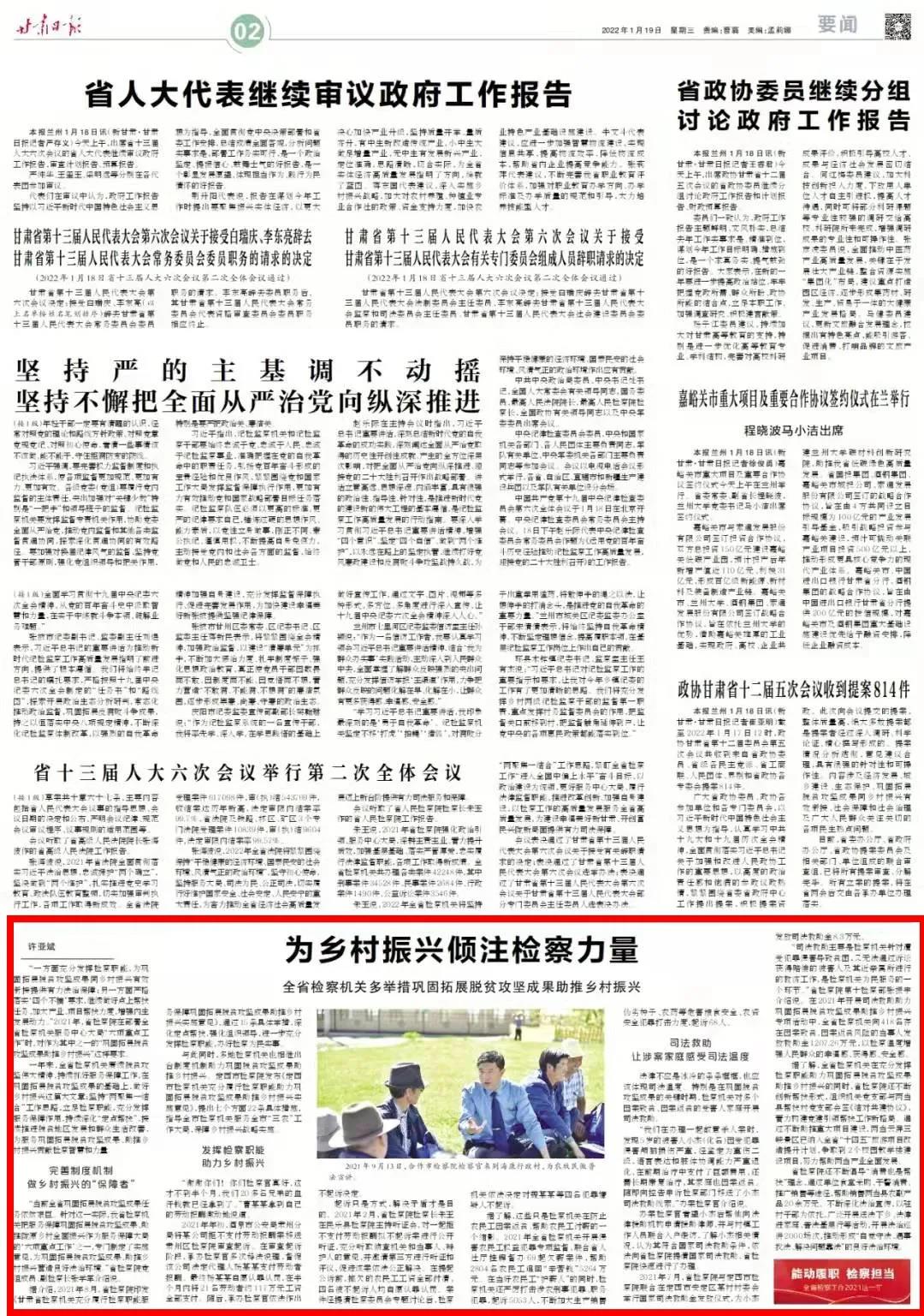 2022年1月19日,甘肃日报二版刊发《为乡村振兴倾注检察力量——甘肃省检察