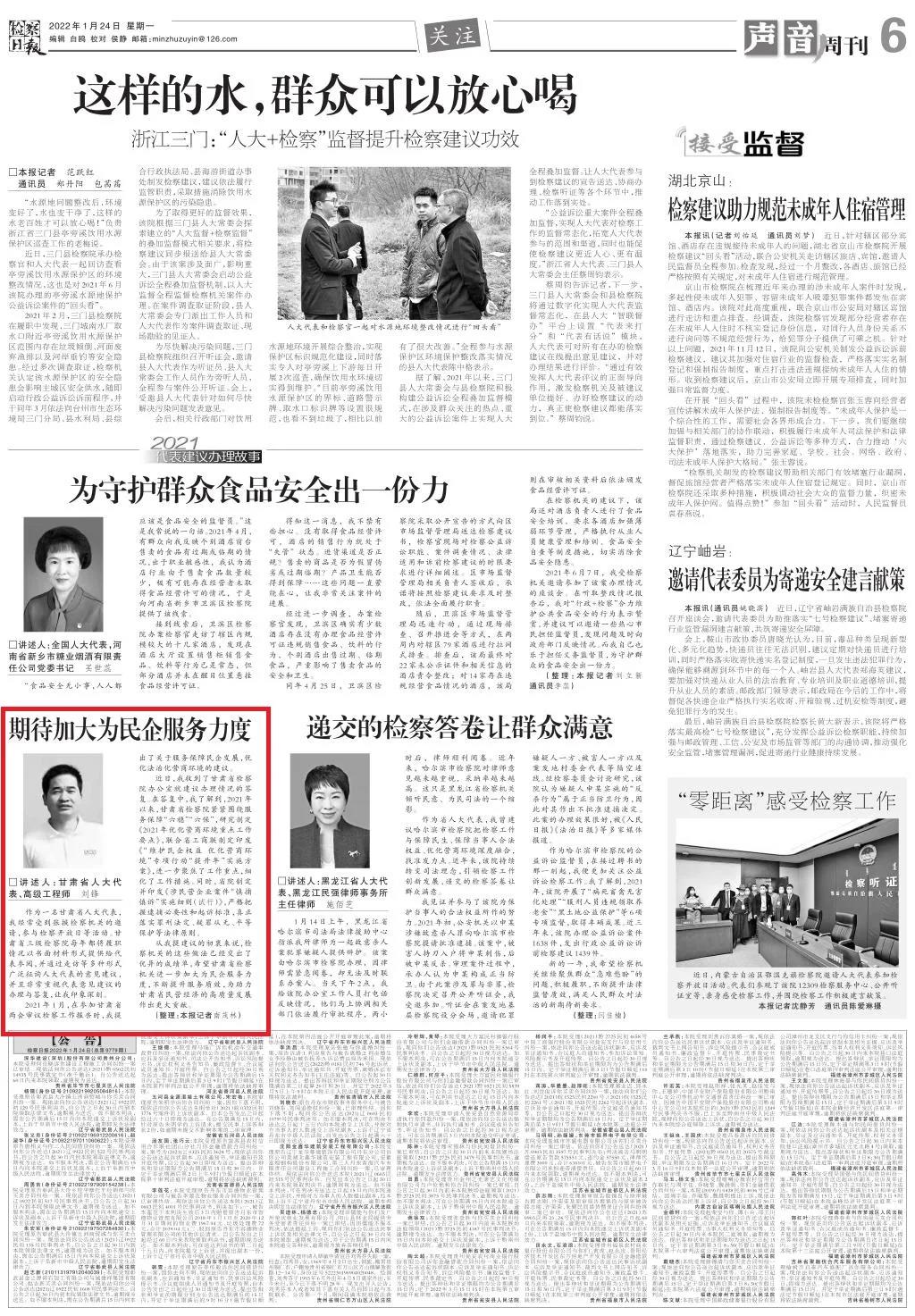 2022年1月24日,检察日报六版刊发《期待加大为民企服务力度》。