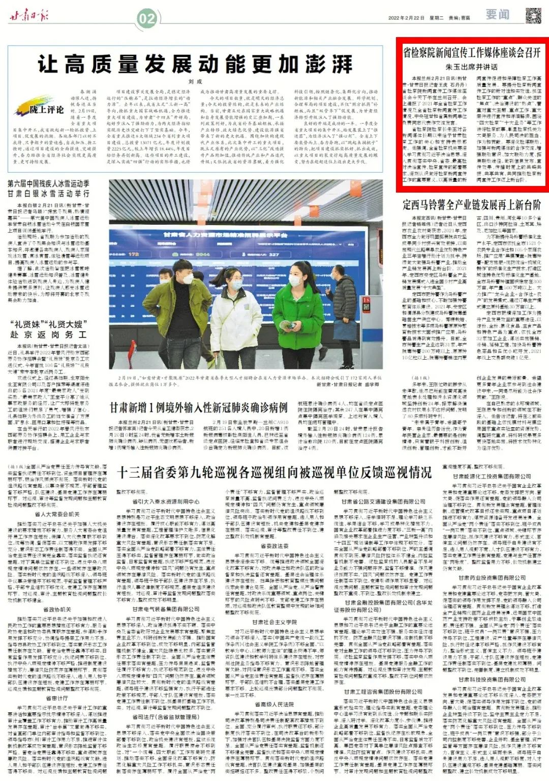 2022年2月22日甘肃日报二版刊发《省检察院新闻宣传工作媒体座谈会召开 朱玉出席并讲话》。