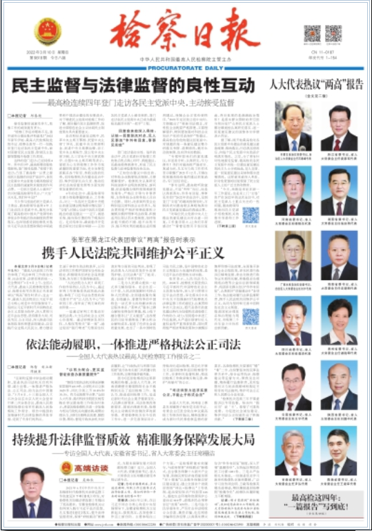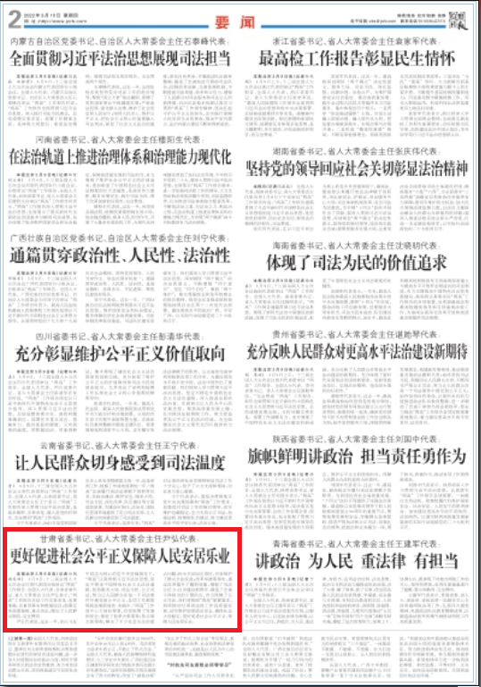 022年3月10日检察日报头版、二版刊发《全国人大代表,甘肃省委书记、省人大常委会主任尹弘:更好促进社会公平正义保障人民安居乐业》。